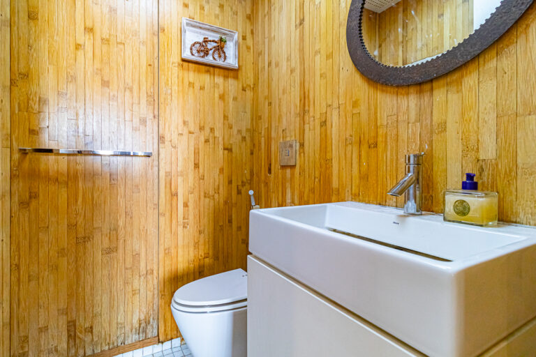 A sala é espaçosa e acolhedora, com um belo piso de tacos, duas varandas internas e muita luz. Conta ainda com um escritório e um lavabo (que na verdade é um banheiro social completo).