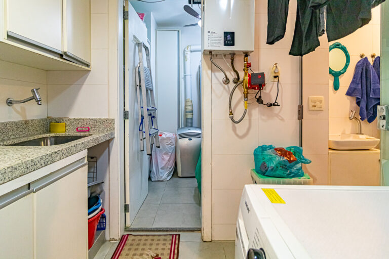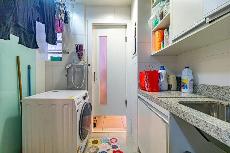 A cozinha é integrada à sala através de uma grande porta de correr. É bem equipada, aconchegante e tem uma pequena copa para duas pessoas. Conta ainda com área de serviço separada, dependência e WC.