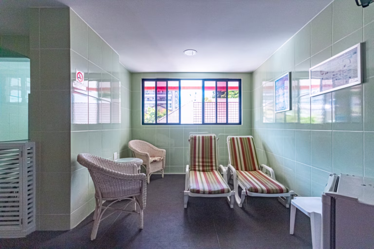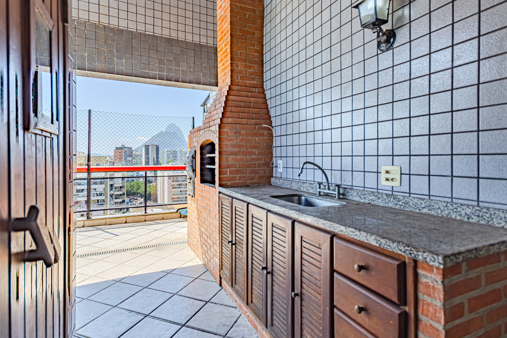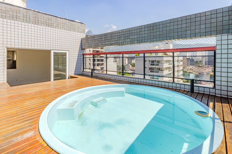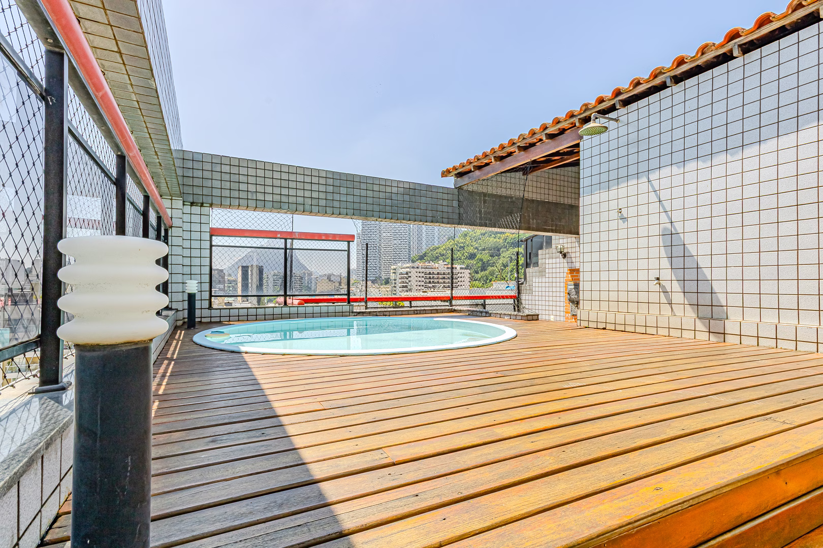 O 2º andar do imóvel é o que todo mundo deseja. Na parte externa ficam a piscina, sauna e churrasqueira, com uma bela vista para o Pão de Açúcar. Na área interna há uma cozinha, espaço para refeições, sala de estar/TV e um lavabo.