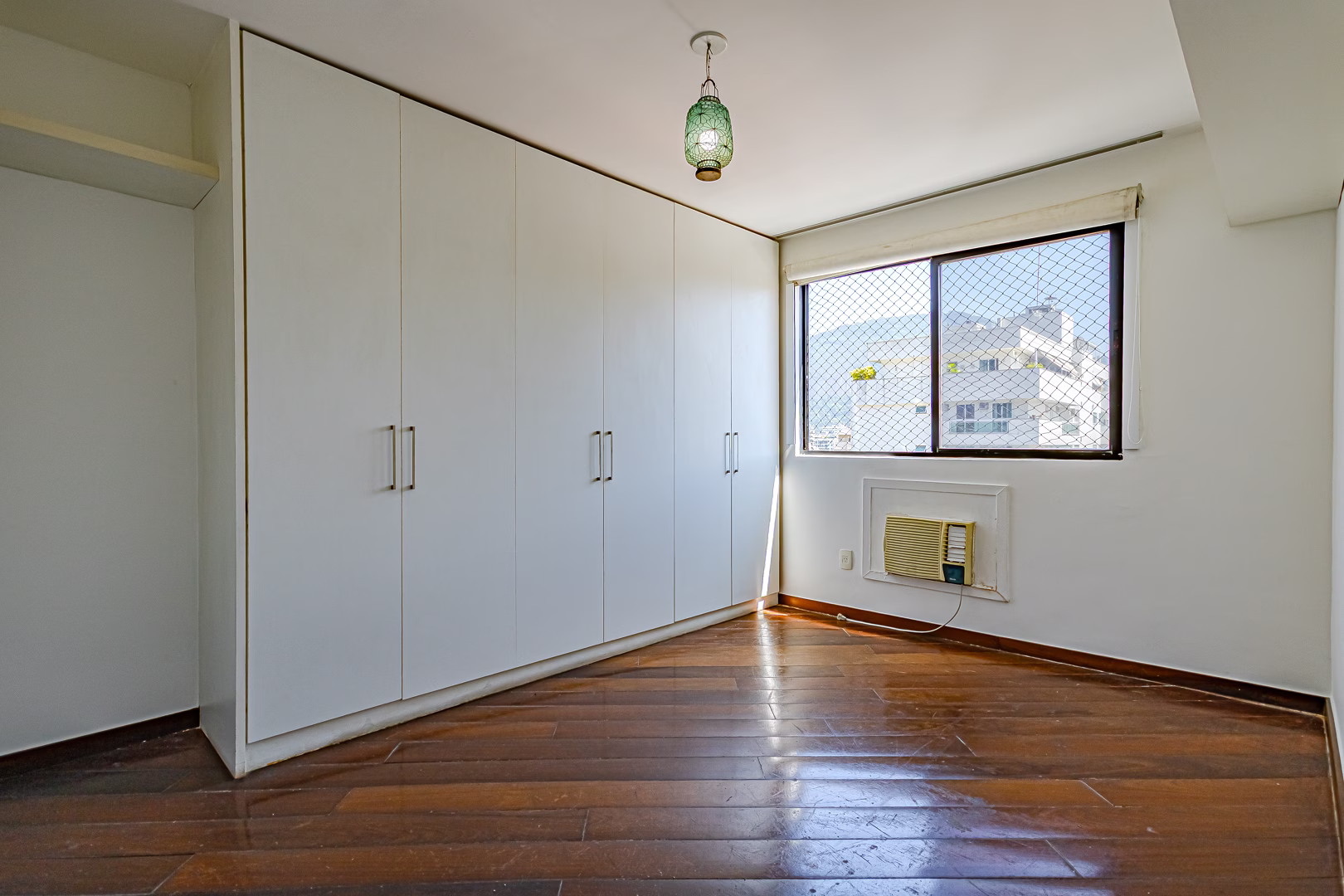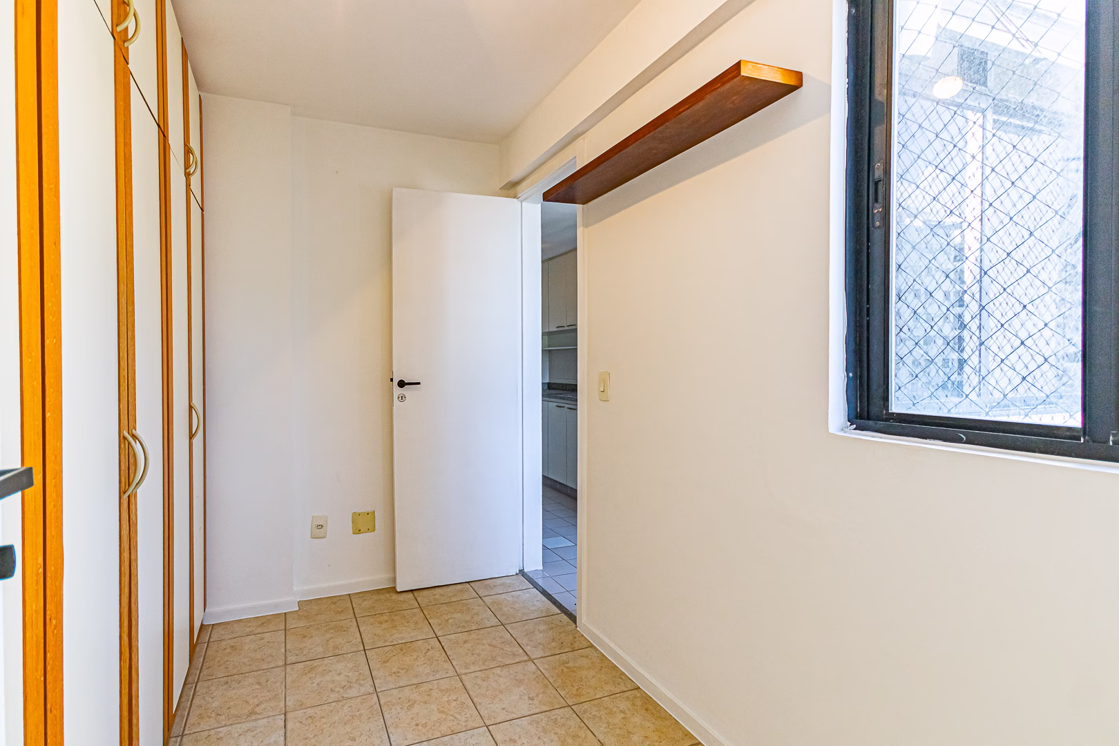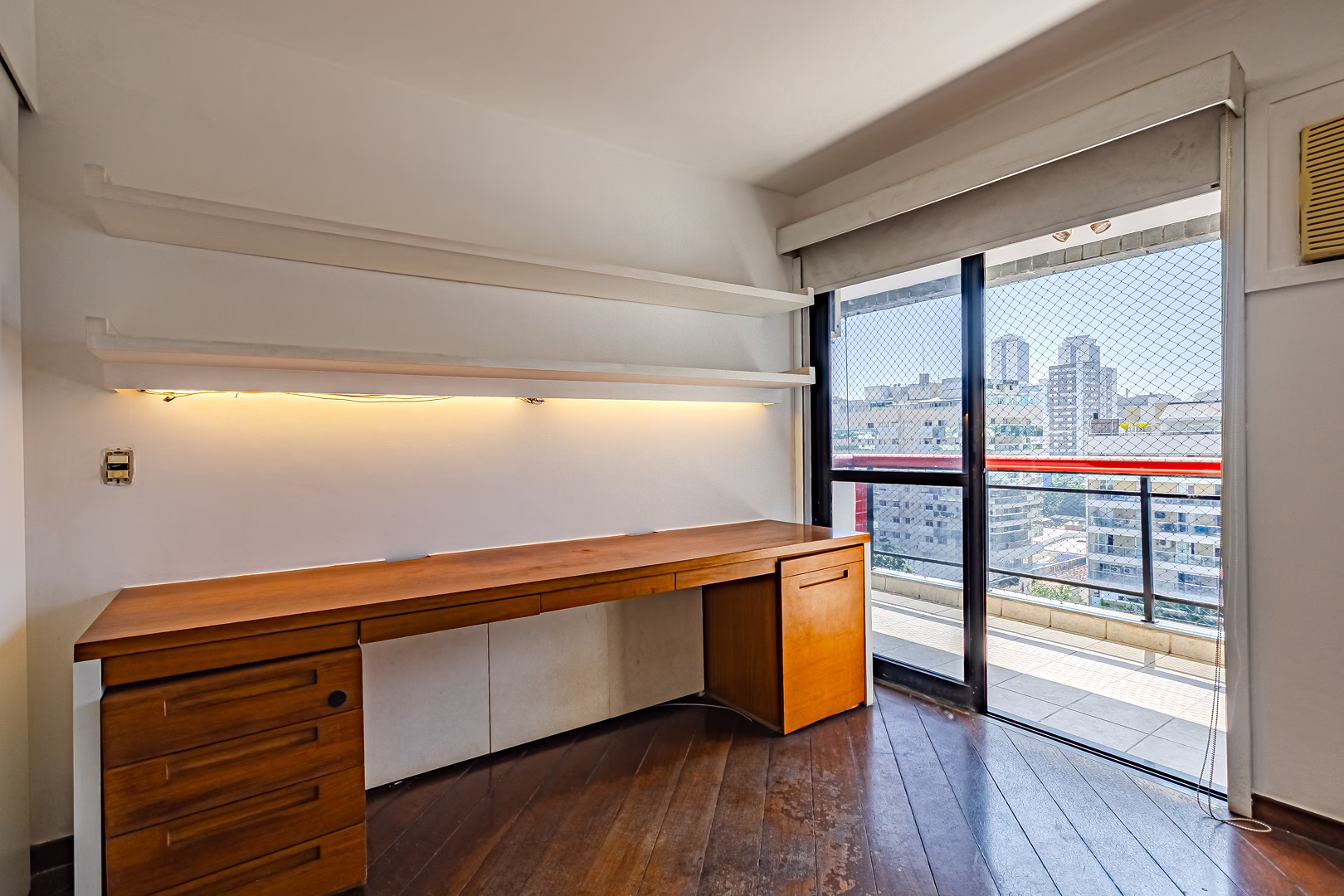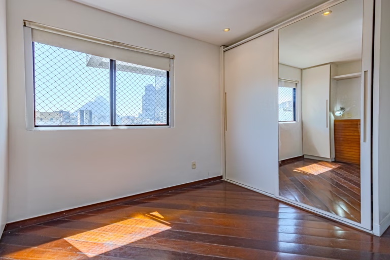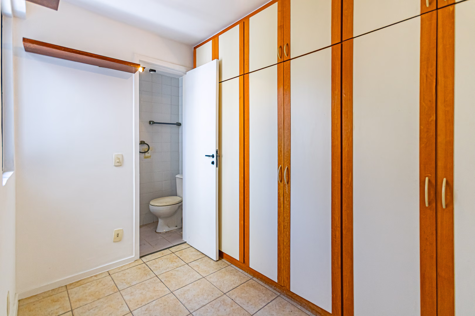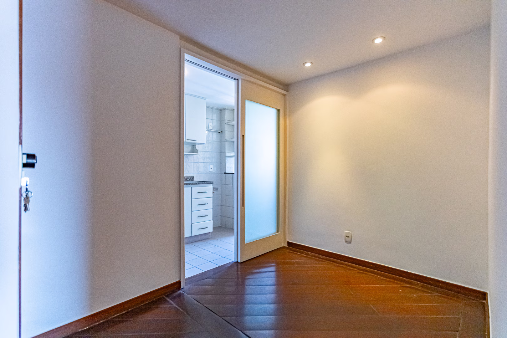 A área íntima é composta por 3 quartos, sendo 1 suíte e mais 1 banheiro social. Na planta atual, o 3º quarto é usado como escritório e é o único com acesso à varanda, que também tem vista livre para o Pão de Açúcar. Todos os cômodos contam com marcenaria planejada e o banheiro da suíte tem ventilação natural.
