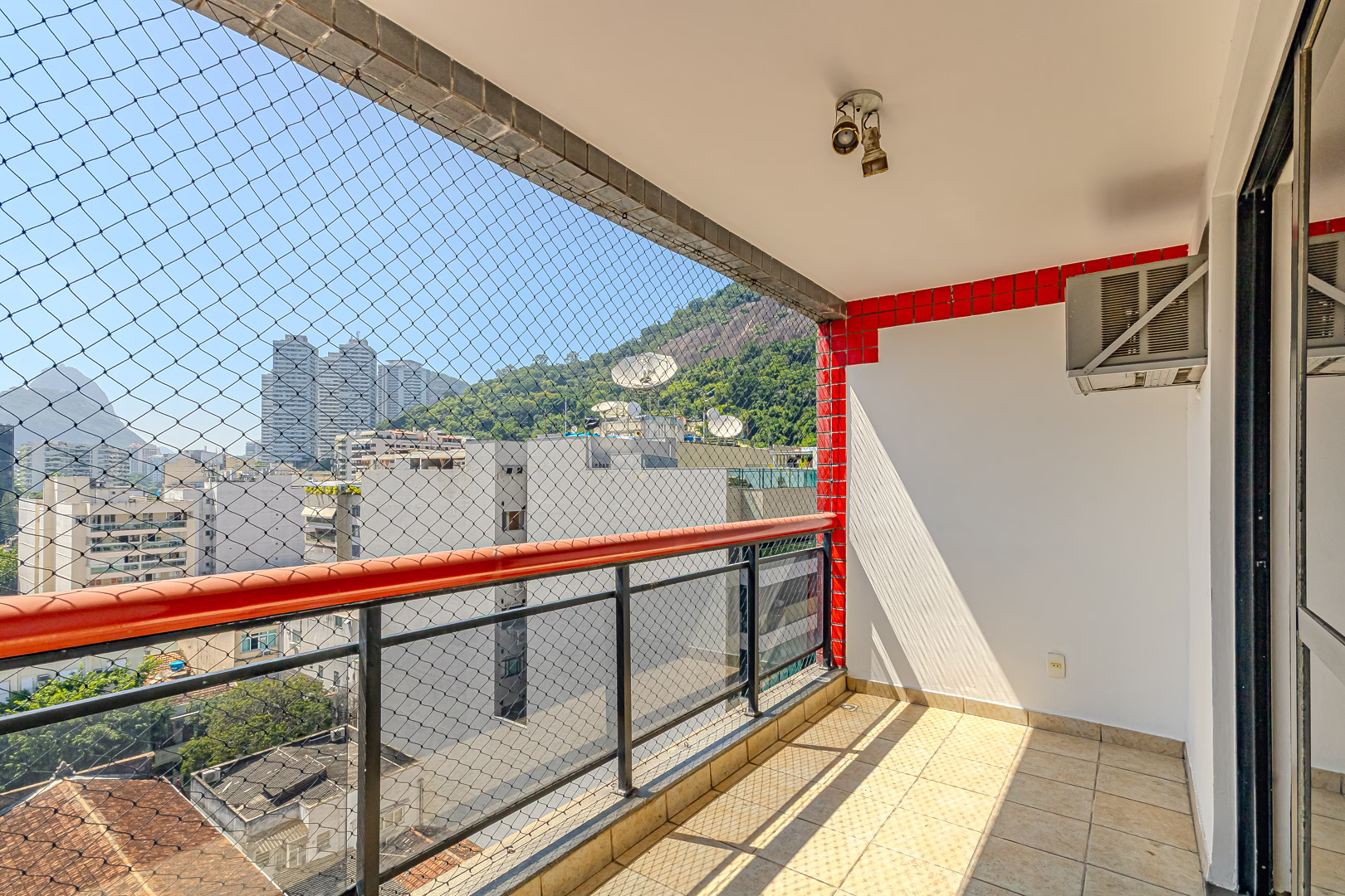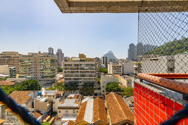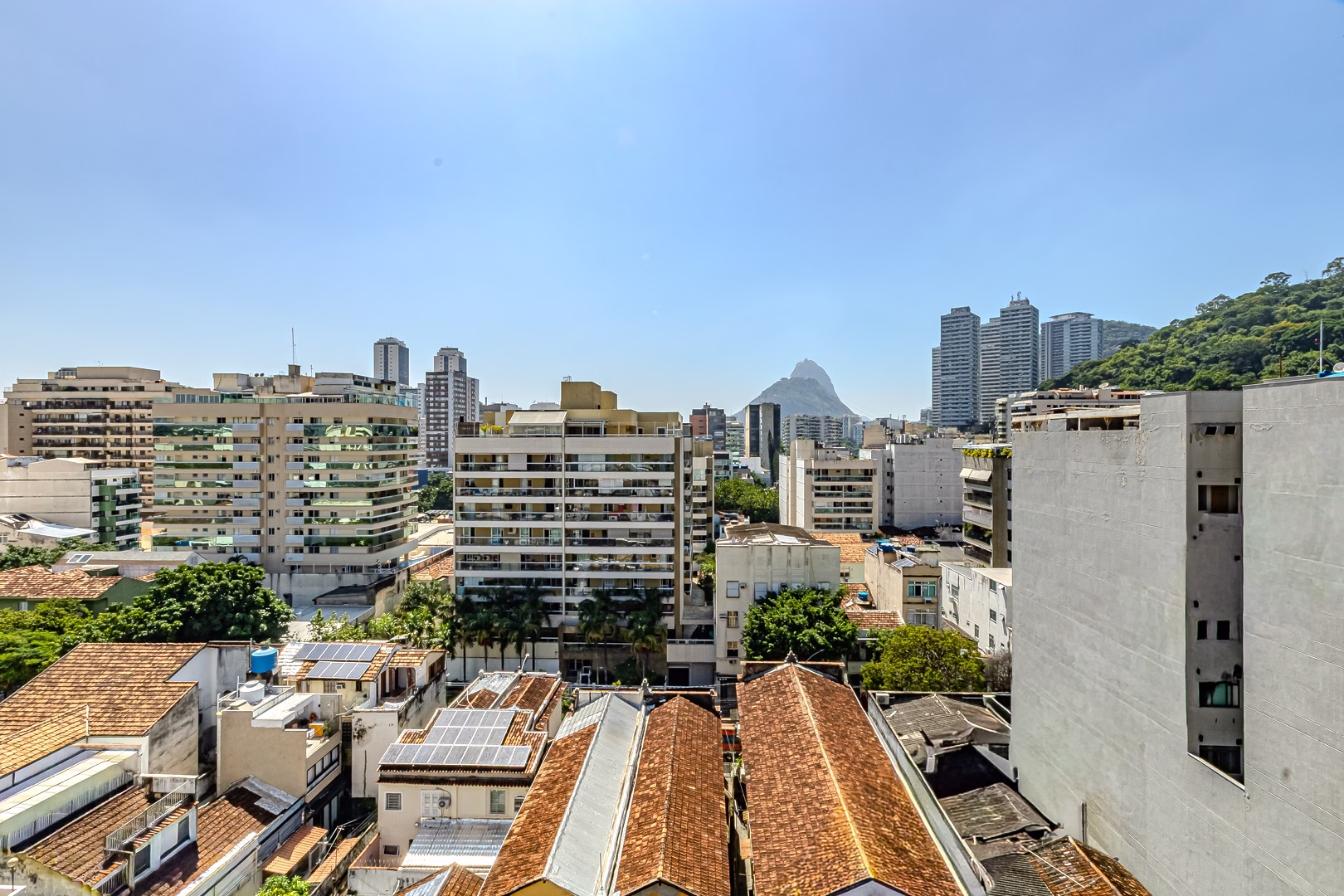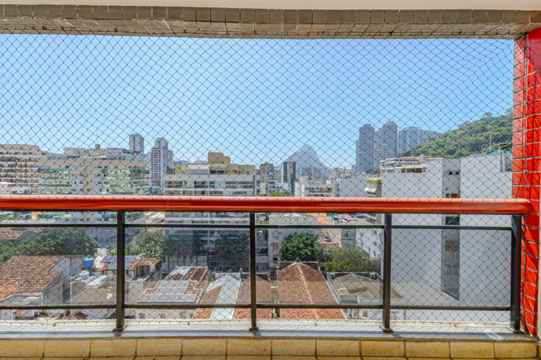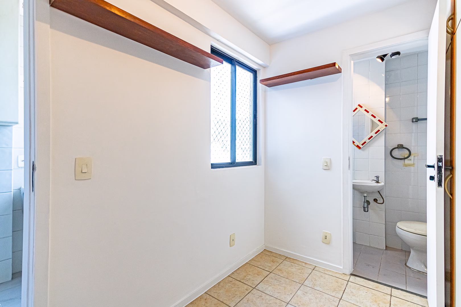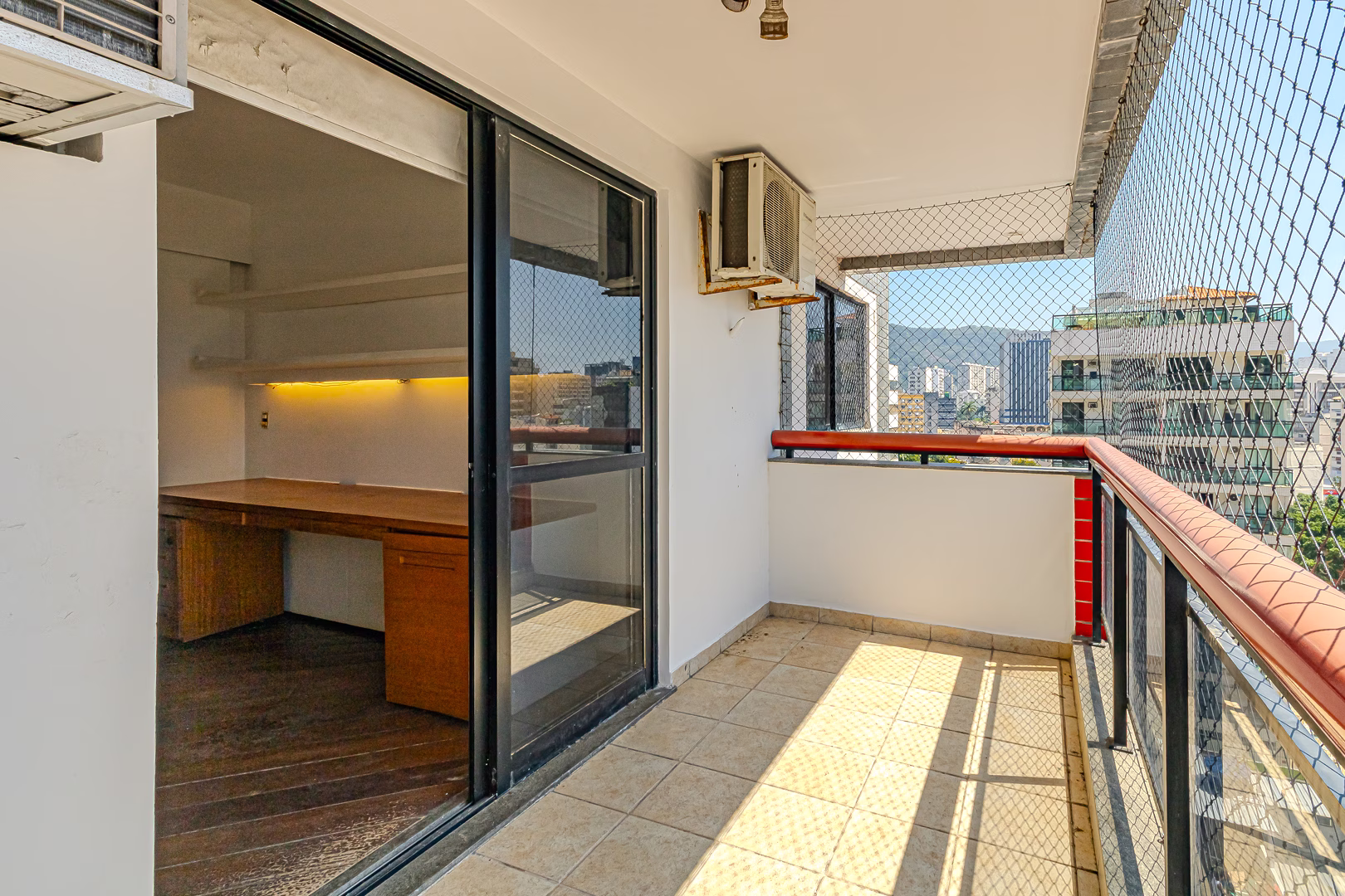 A área íntima é composta por 3 quartos, sendo 1 suíte e mais 1 banheiro social. Na planta atual, o 3º quarto é usado como escritório e é o único com acesso à varanda, que também tem vista livre para o Pão de Açúcar. Todos os cômodos contam com marcenaria planejada e o banheiro da suíte tem ventilação natural.