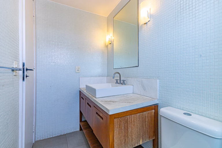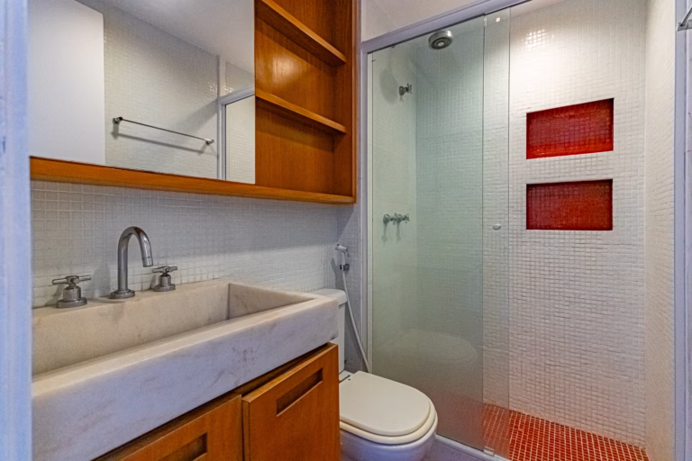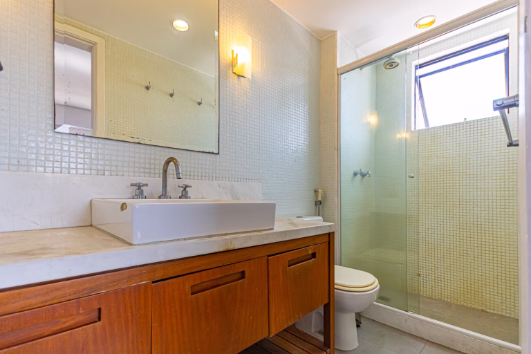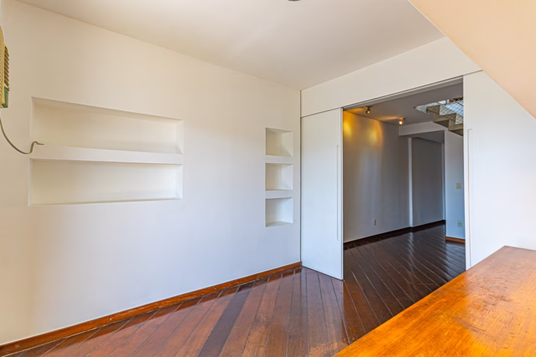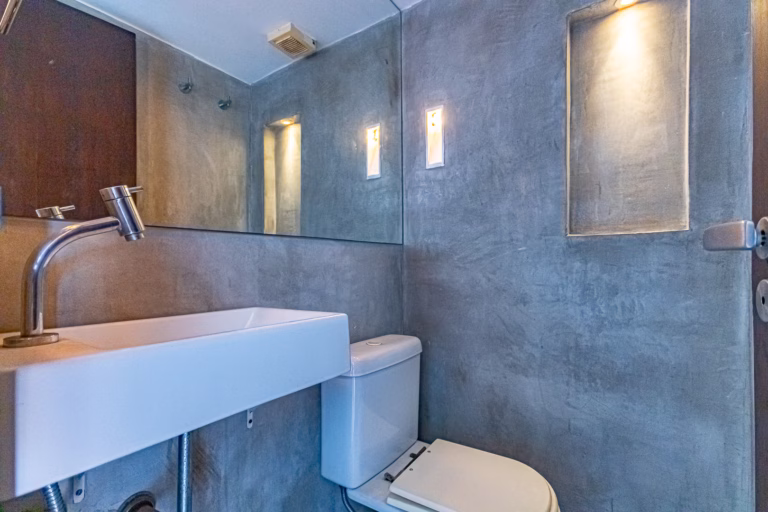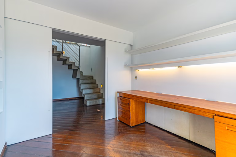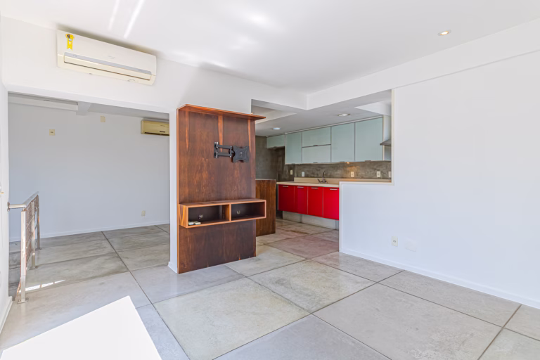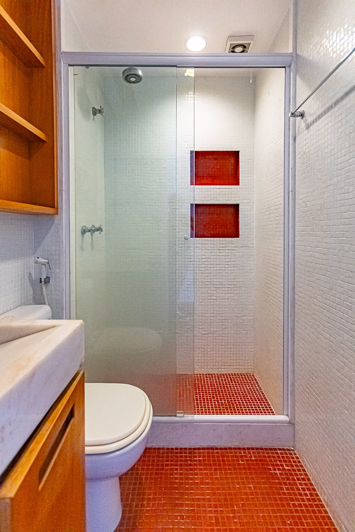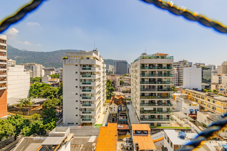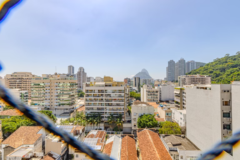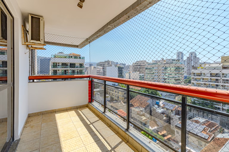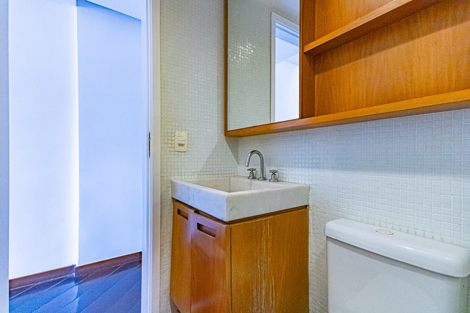 A área íntima é composta por 3 quartos, sendo 1 suíte e mais 1 banheiro social. Na planta atual, o 3º quarto é usado como escritório e é o único com acesso à varanda, que também tem vista livre para o Pão de Açúcar. Todos os cômodos contam com marcenaria planejada e o banheiro da suíte tem ventilação natural.