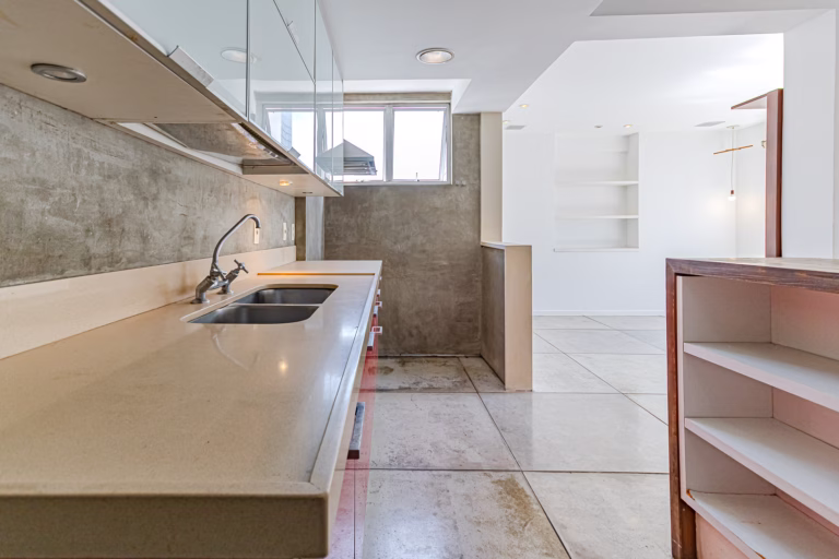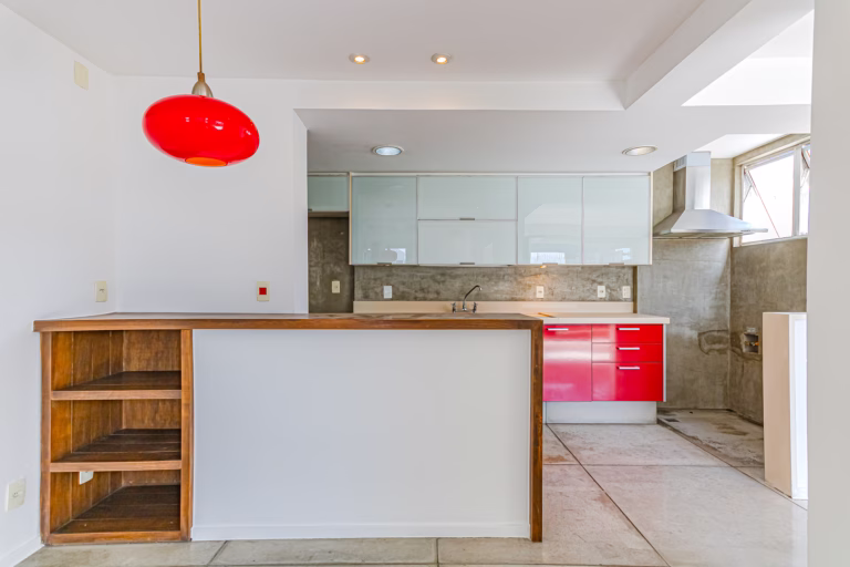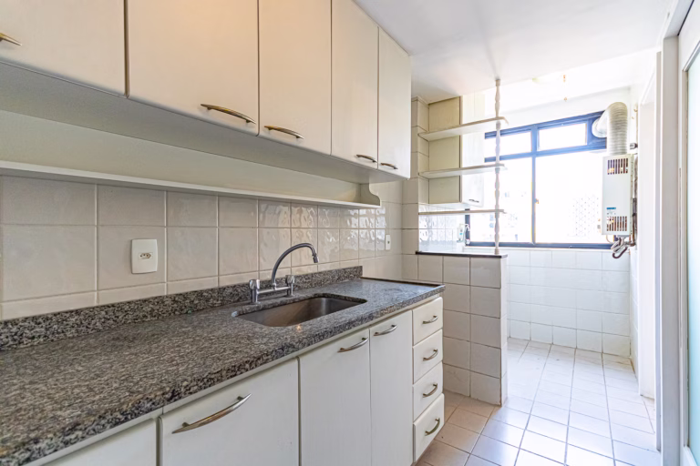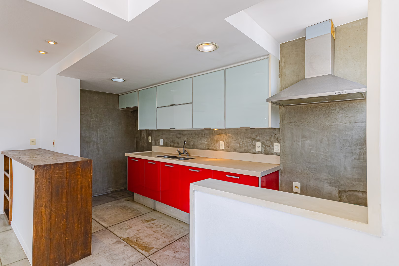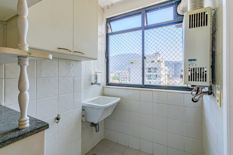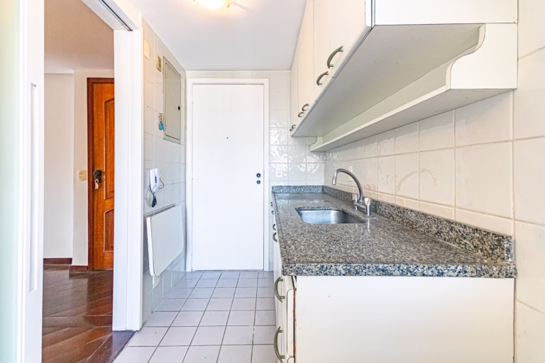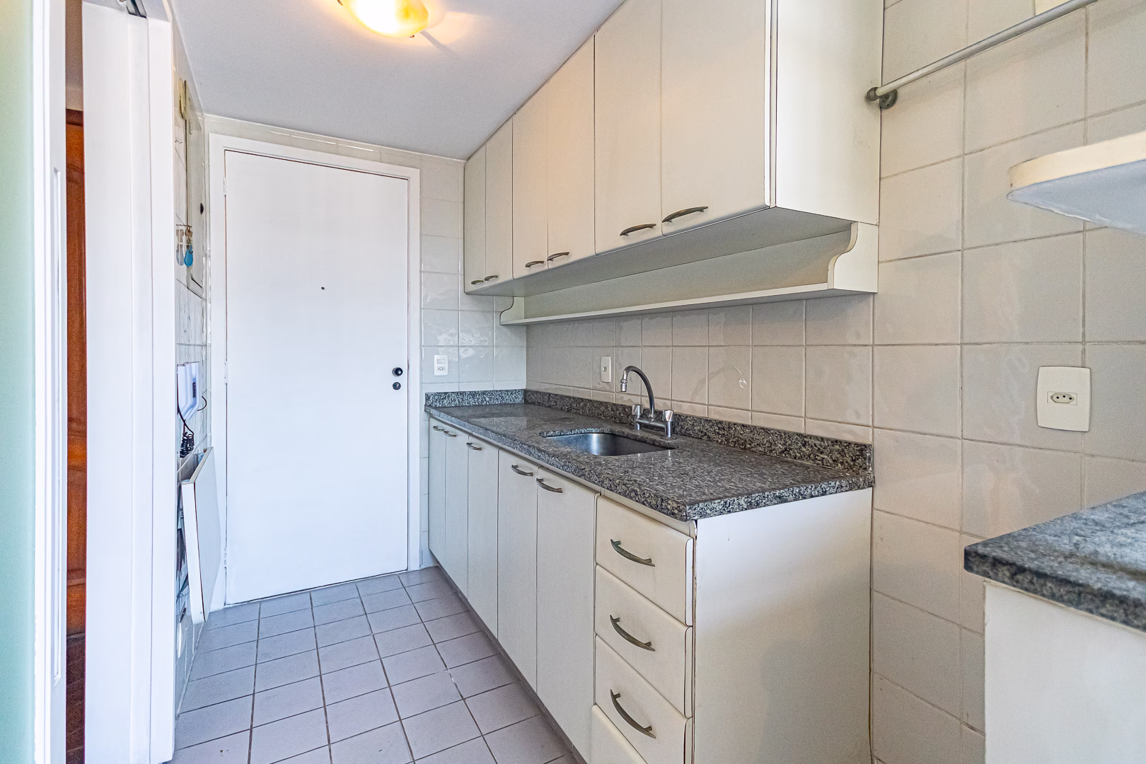 Há outra cozinha neste piso. Pequena e funcional. Conta ainda com área de serviço, dependência e WC.