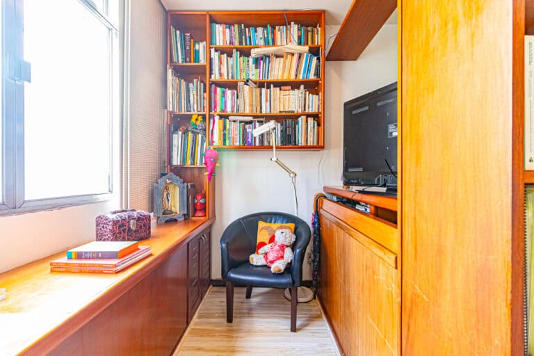A área social é rigorosamente dividida em 2 partes – a área externa, anexa a uma sala de TV, que fica de frente para a Rua Faro e outra sala, que fica nos fundos do apê, usada com sala de estar, TV e refeições, de onde se pode ver até a Pedra da Gávea.
