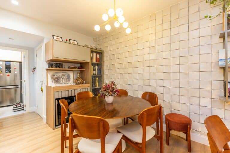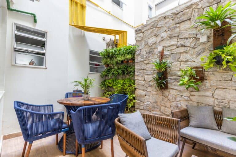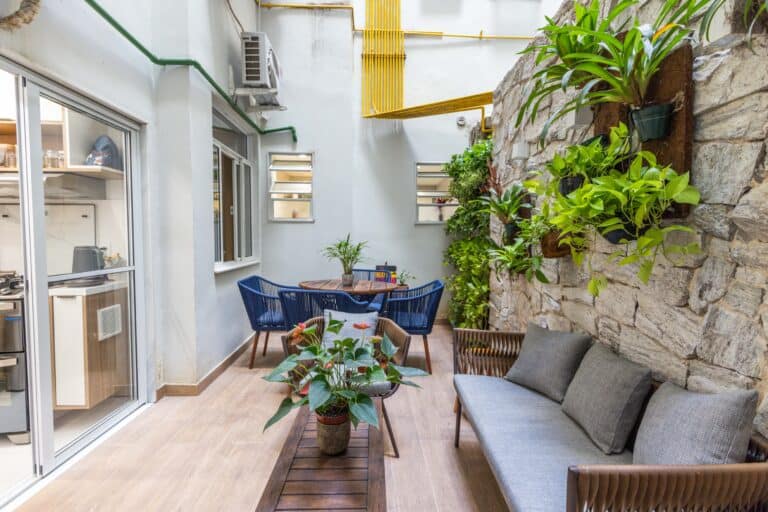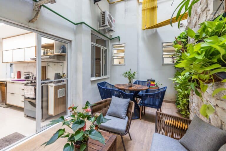A parte externa é bem gostosa, sendo perfeita para uma cerveja com os amigos. Ela é acessada pela cozinha.