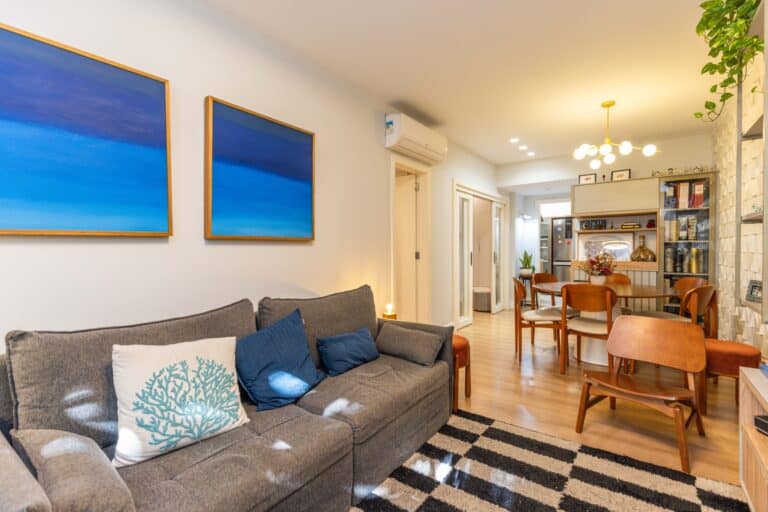 O imóvel de 119m² fica localizado na Rua General Venâncio Flores, a 2 minutos caminhando até a praia.
