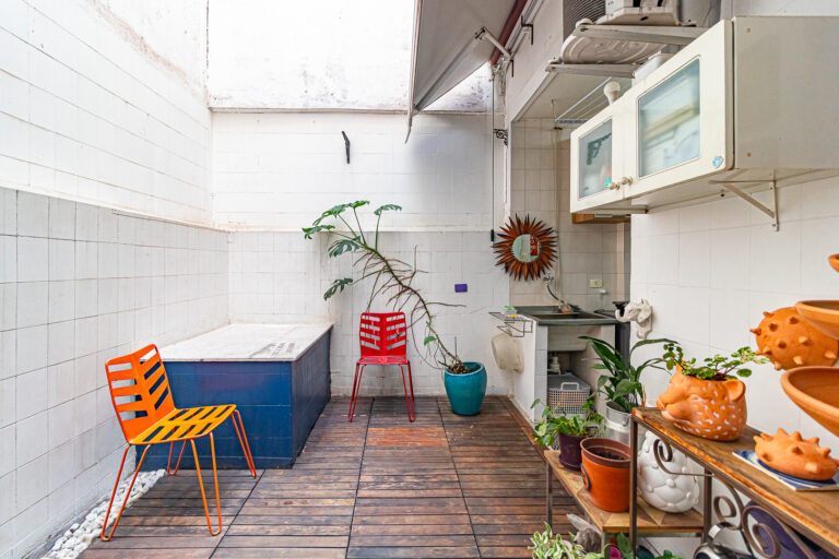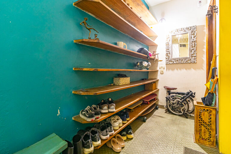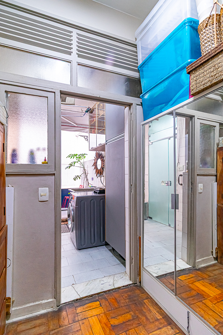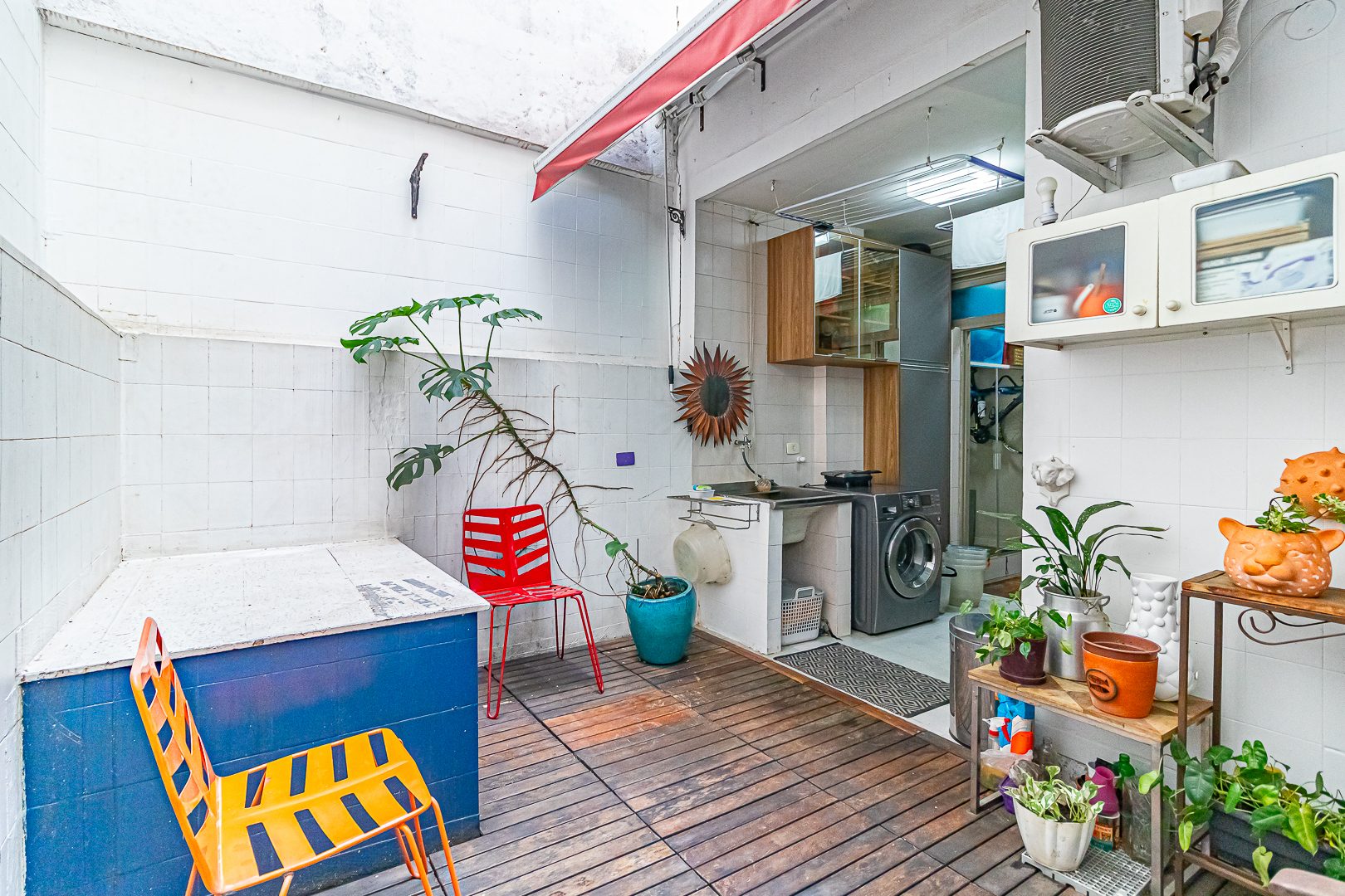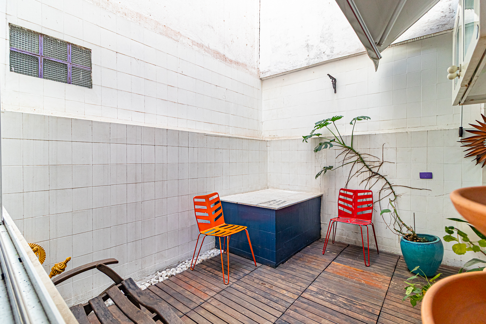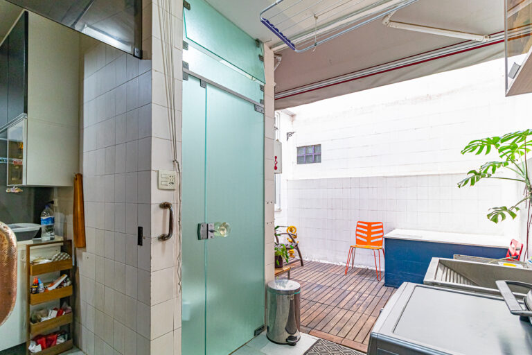 O apê tem uma deliciosa área externa nos fundos, que pode ser acessada tanto pelo 2º quarto, quanto pela cozinha. Conta ainda com um hall privativo, cheio de prateleiras, para guardar as coisas usadas no dia a dia, sem ocupar o espaço do apartamento.