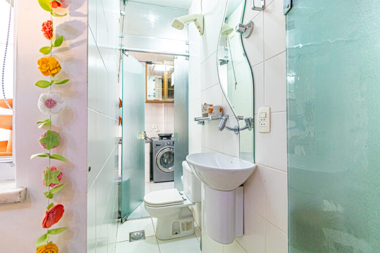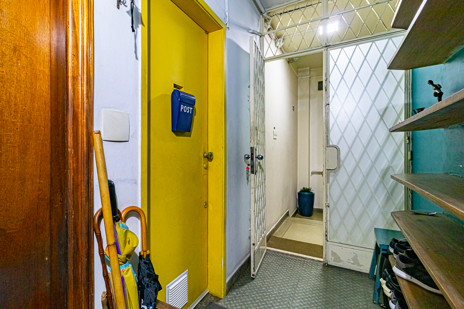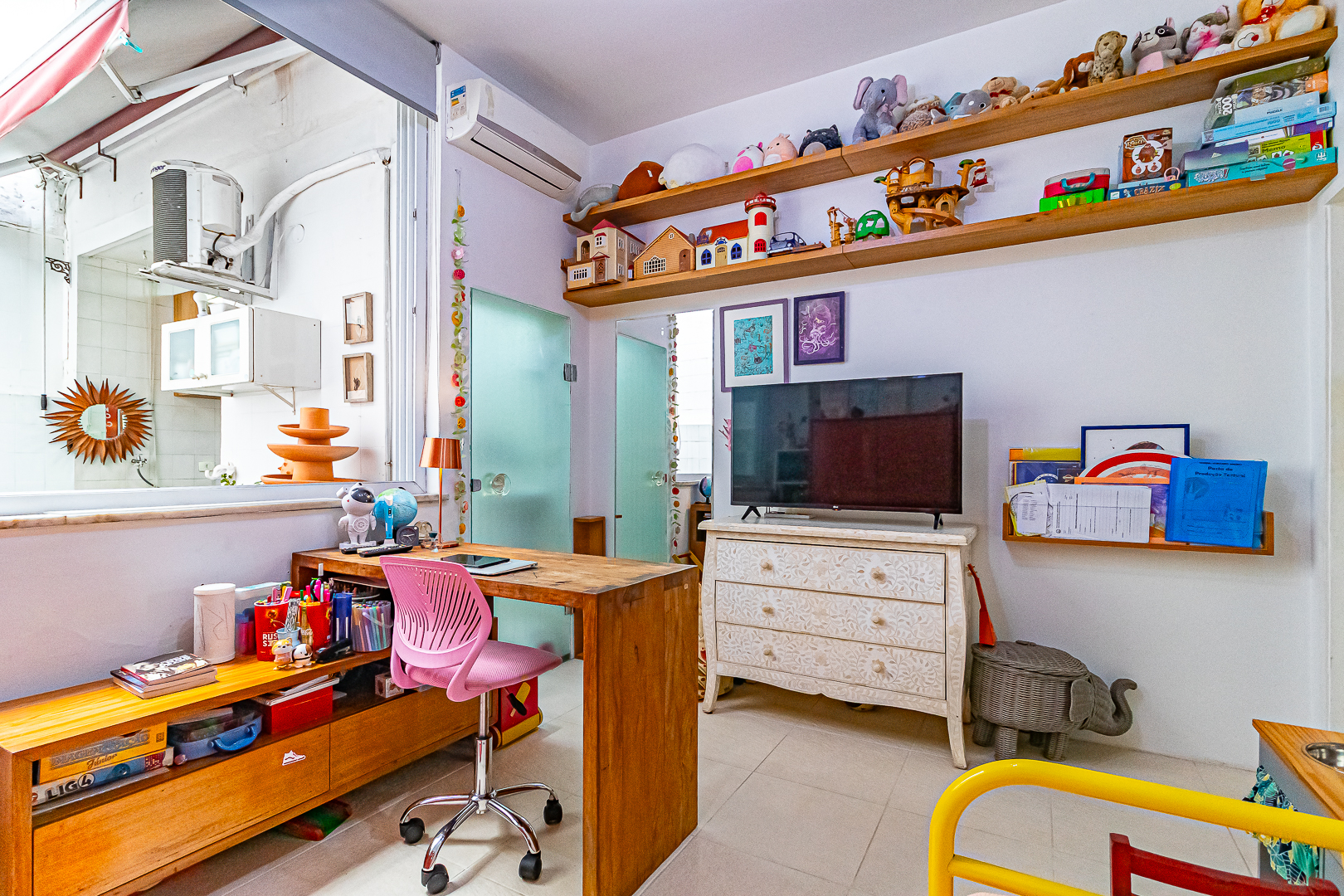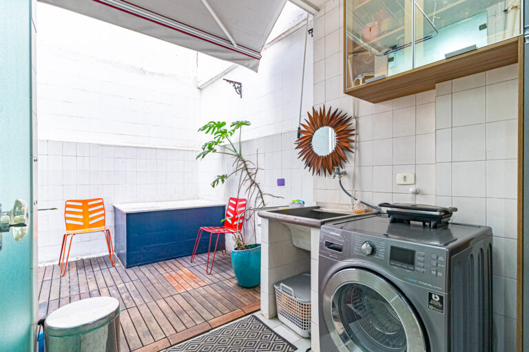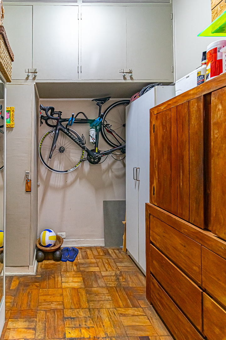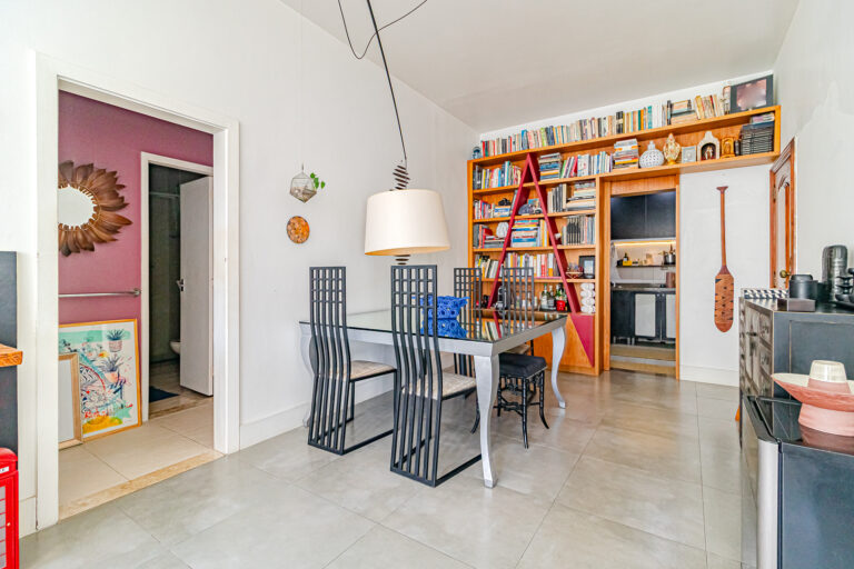 O apê tem uma deliciosa área externa nos fundos, que pode ser acessada tanto pelo 2º quarto, quanto pela cozinha. Conta ainda com um hall privativo, cheio de prateleiras, para guardar as coisas usadas no dia a dia, sem ocupar o espaço do apartamento.