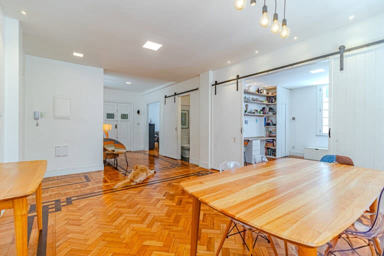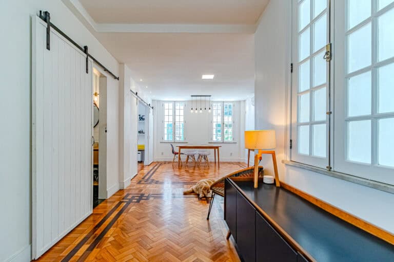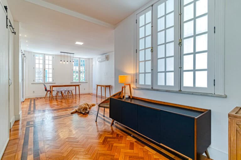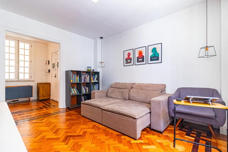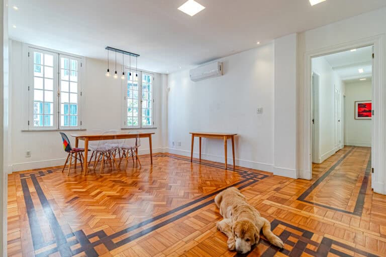 A sala é ampla e iluminada, com inúmeros janelões e um belíssimo piso de tacos.