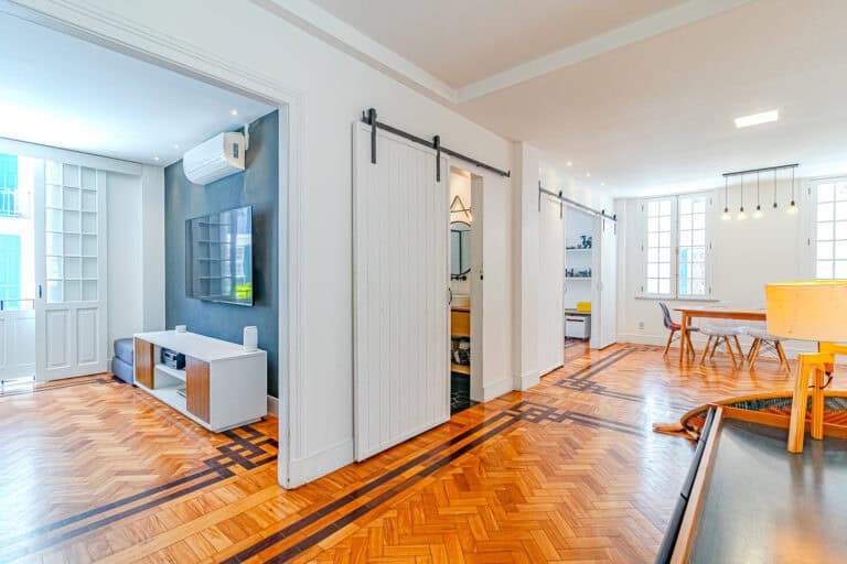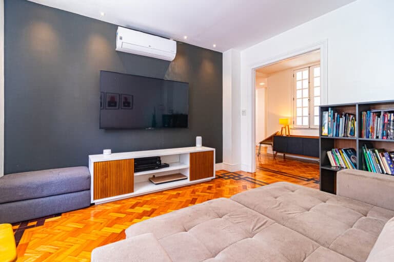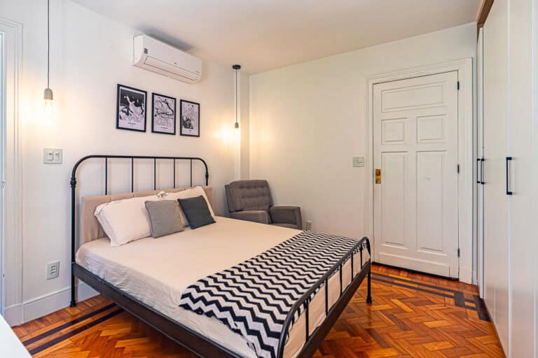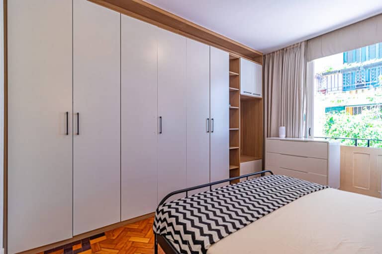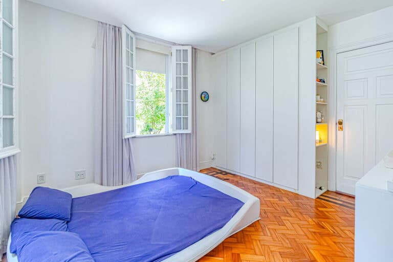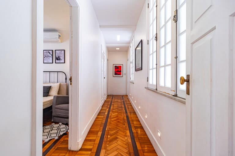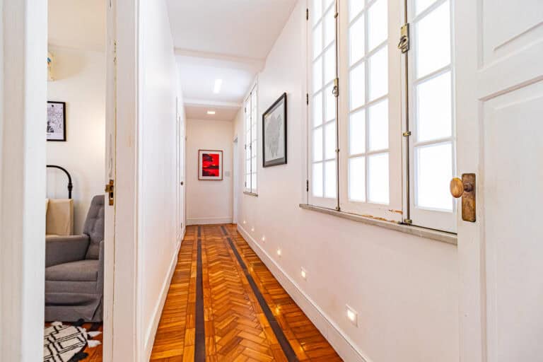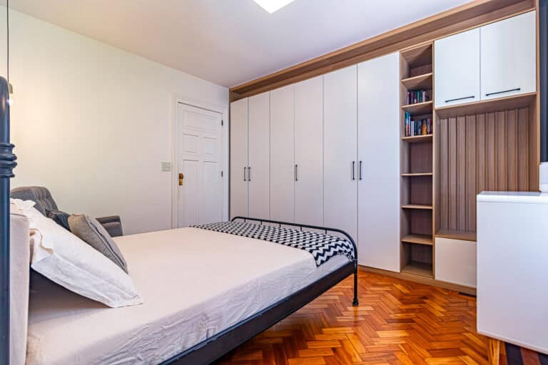 O corredor leva à área íntima, com mais 2 quartos, que na realidade são suítes canadenses, utilizados no apê como a suíte do casal e a das crianças. Ambos com armários planejados e aparelhos de ar-condicionado tipo split.
