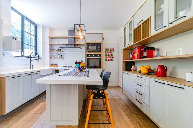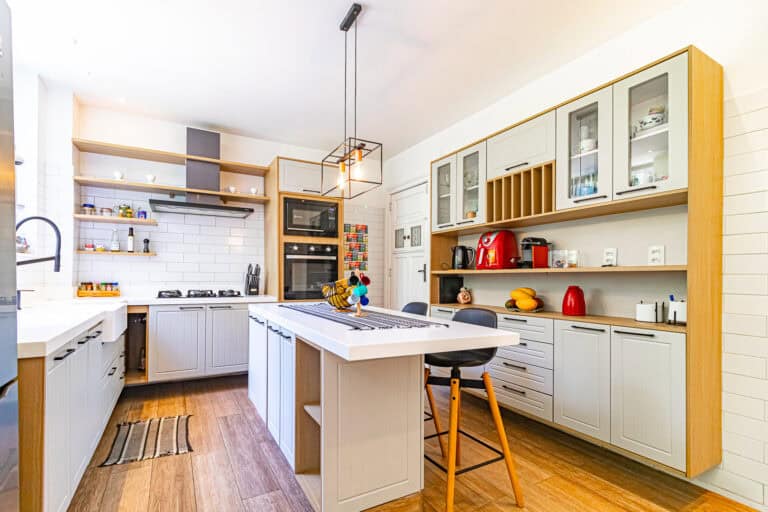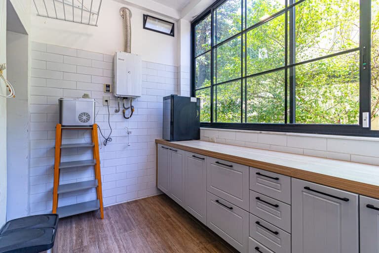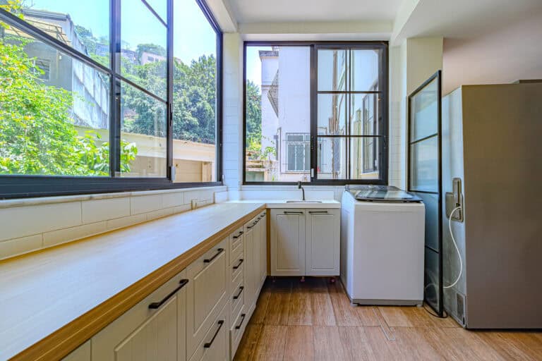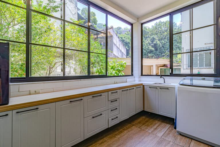 A cozinha então é indescritível. Conta com uma bela marcenaria e enormes janelas que dão para os fundos do prédio, uma área comum bem arborizada, onde não raras vezes, os proprietários montam aquela deliciosa piscina para as crianças.