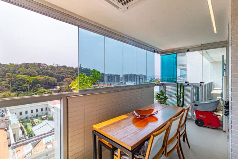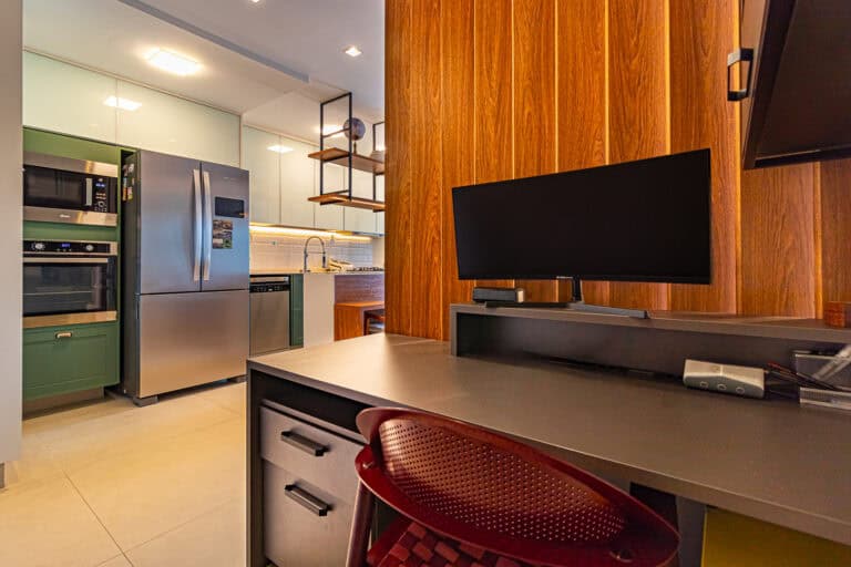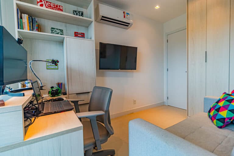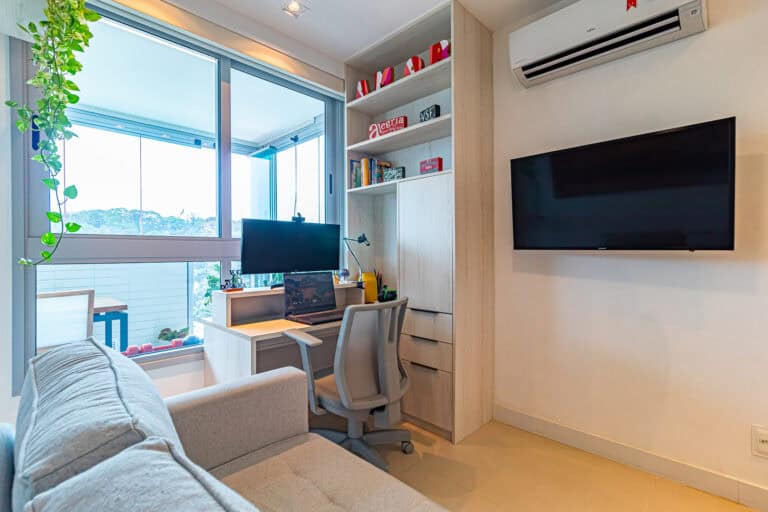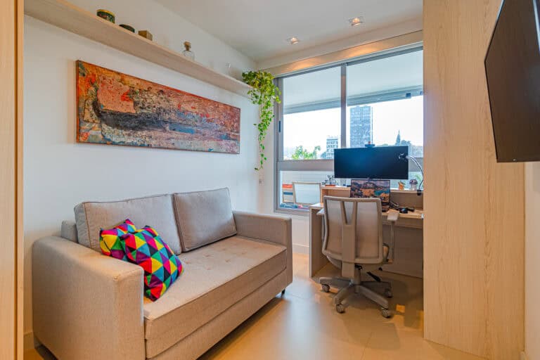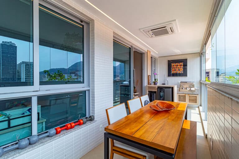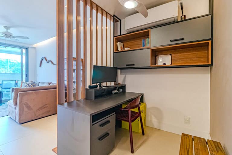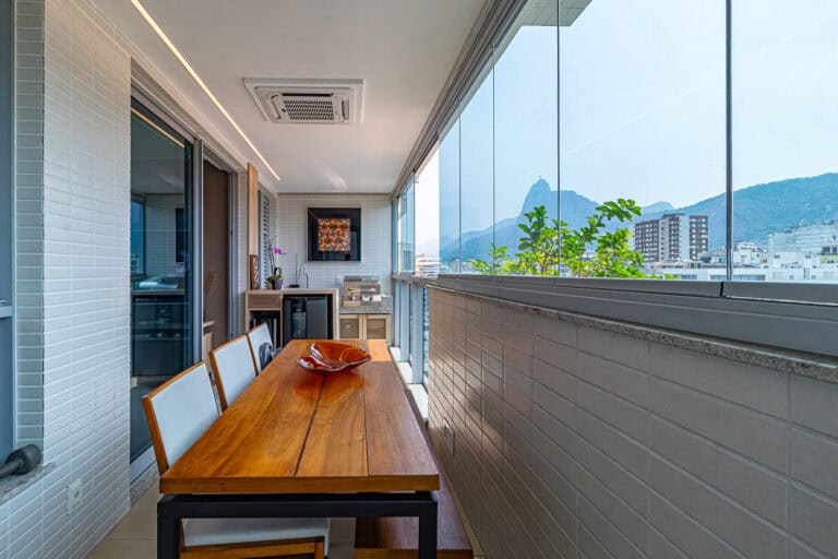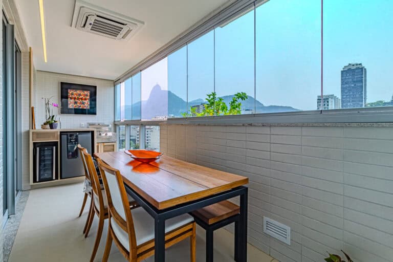 Na área social ficam a sala integrada à varanda gourmet – com churrasqueira, ar-condicionado, cortina de vidro e uma vista qua vai do Cristo à Enseada de Botafogo. Há ainda um bom espaço para trabalhar em home-office, logo na entrada do apê.