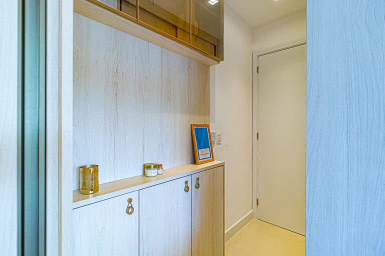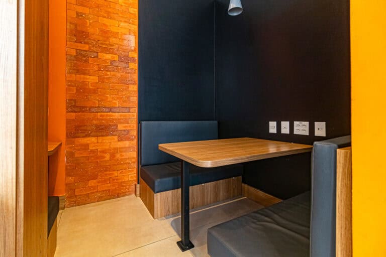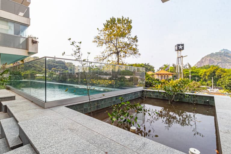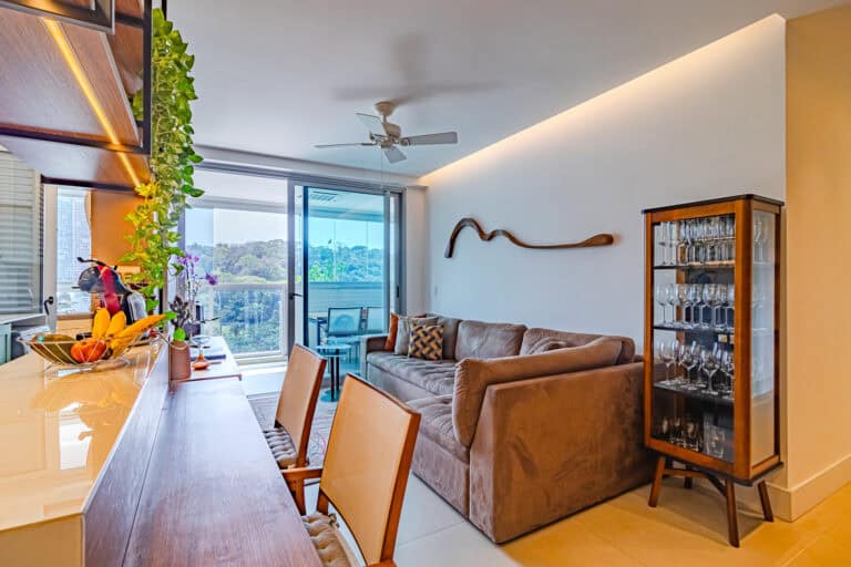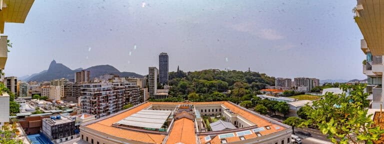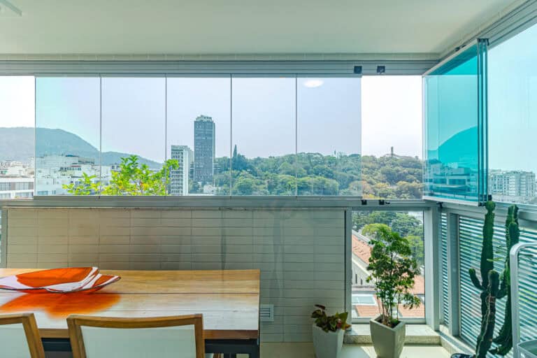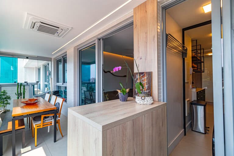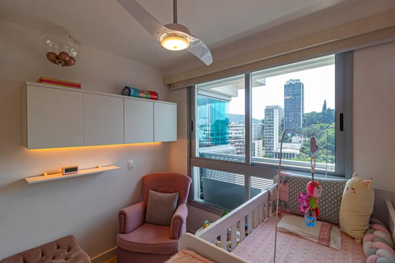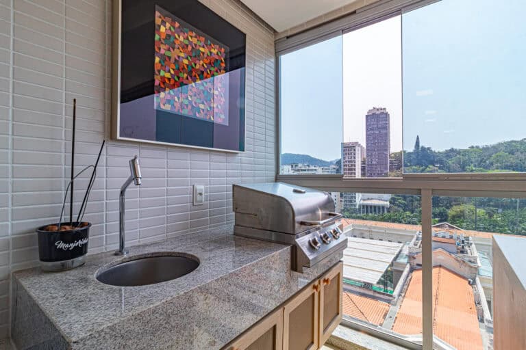 Na área social ficam a sala integrada à varanda gourmet – com churrasqueira, ar-condicionado, cortina de vidro e uma vista qua vai do Cristo à Enseada de Botafogo. Há ainda um bom espaço para trabalhar em home-office, logo na entrada do apê.