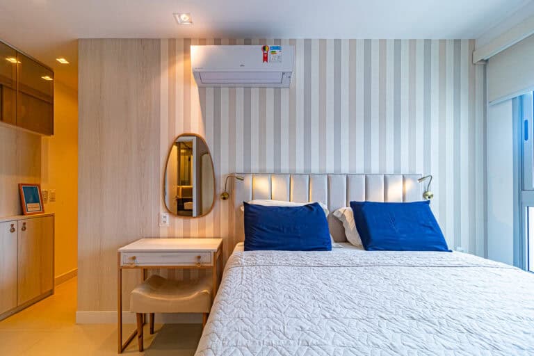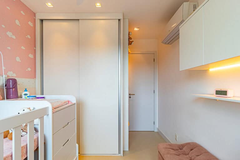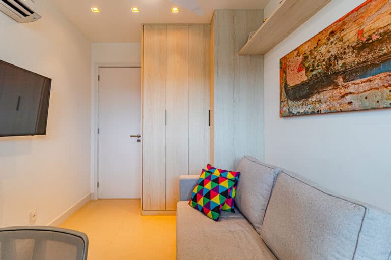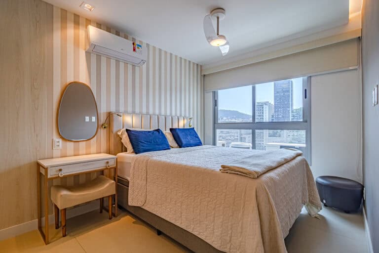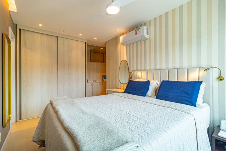 A área íntima conta com 3 quartos, sendo uma suíte e mais 1 banheiro social. Todos os cômodos têm a mema vista que a sala e, assim como o resto do imóvel, contam com aparelhos de ar-condicionado tipo split, ventiladores de teto e marcenaria de 1ª linha.
