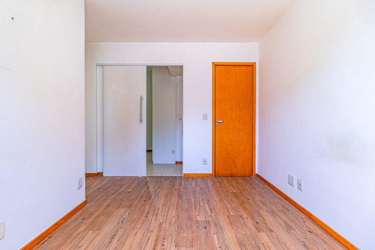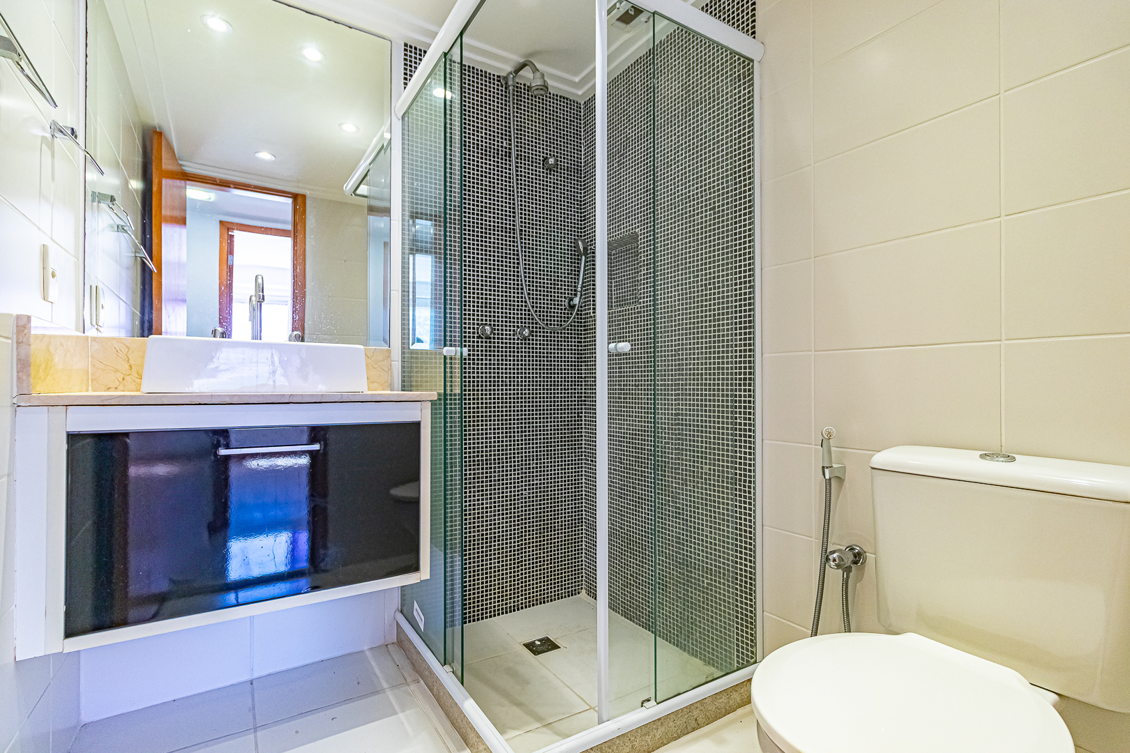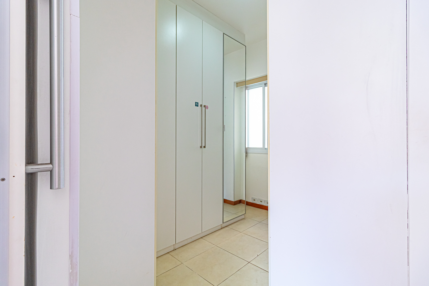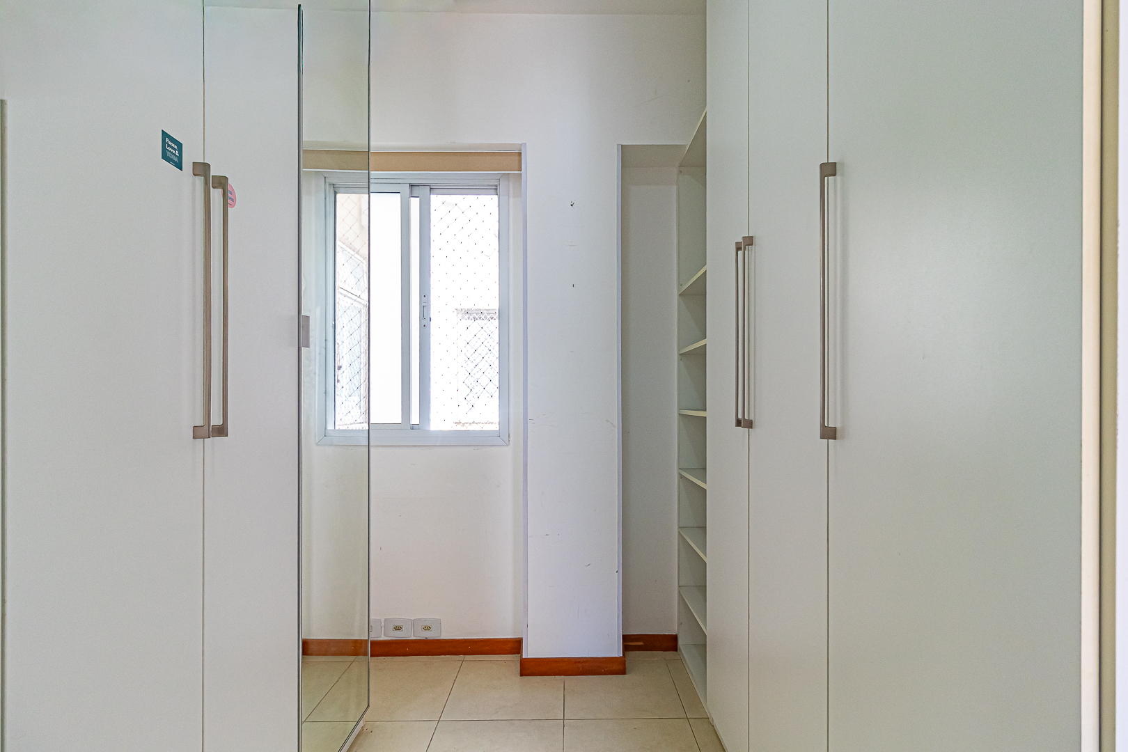 A área íntima é composta por 2 quartos, sendo 1 suíte e mais um banheiro social. A suíte é espaçosa e conta com um closet (dependência revertida) e banheiro com ventilação natural.
