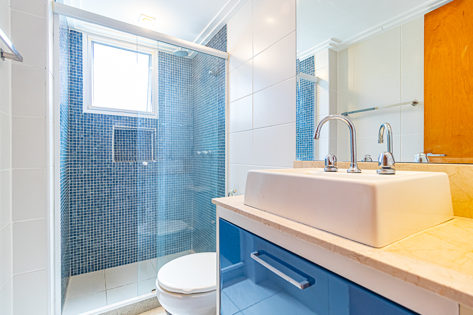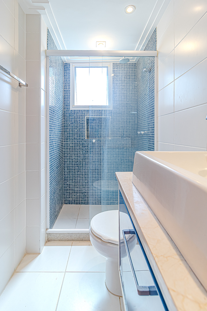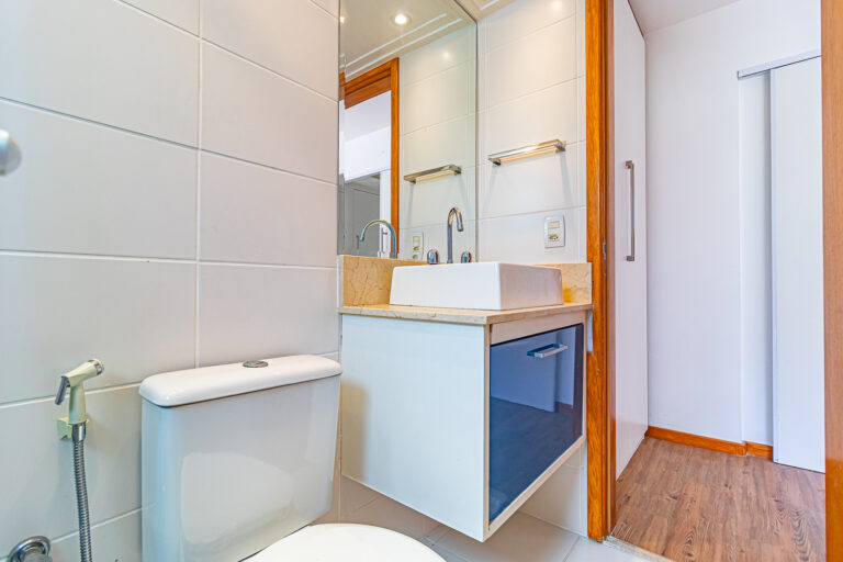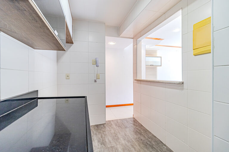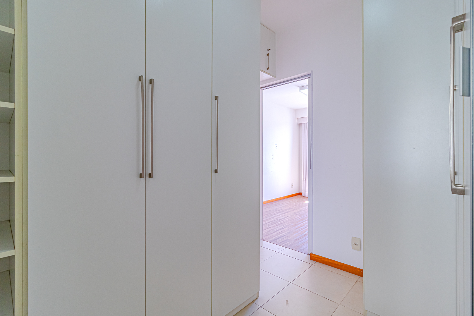 A área íntima é composta por 2 quartos, sendo 1 suíte e mais um banheiro social. A suíte é espaçosa e conta com um closet (dependência revertida) e banheiro com ventilação natural.