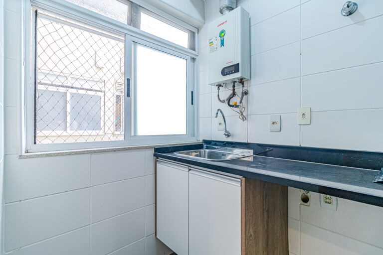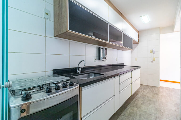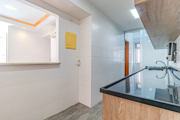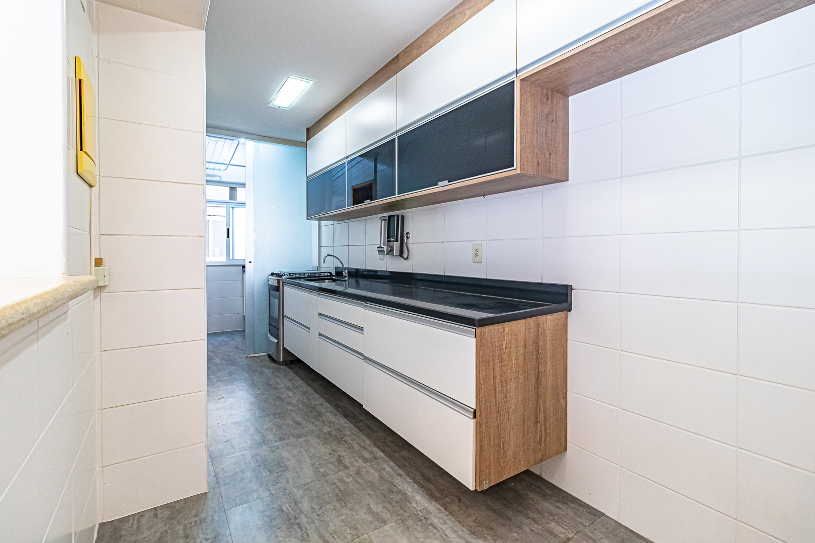A cozinha é americana e repleta de armários. Conta com área de serviço separada e um bom WC.