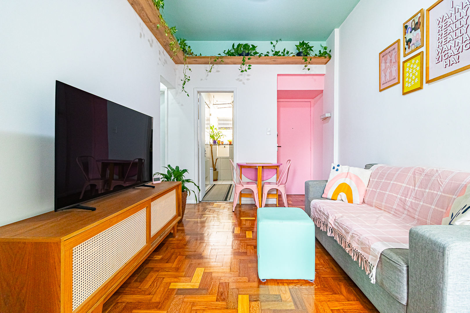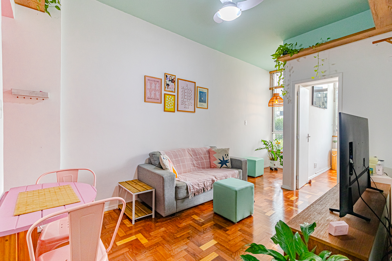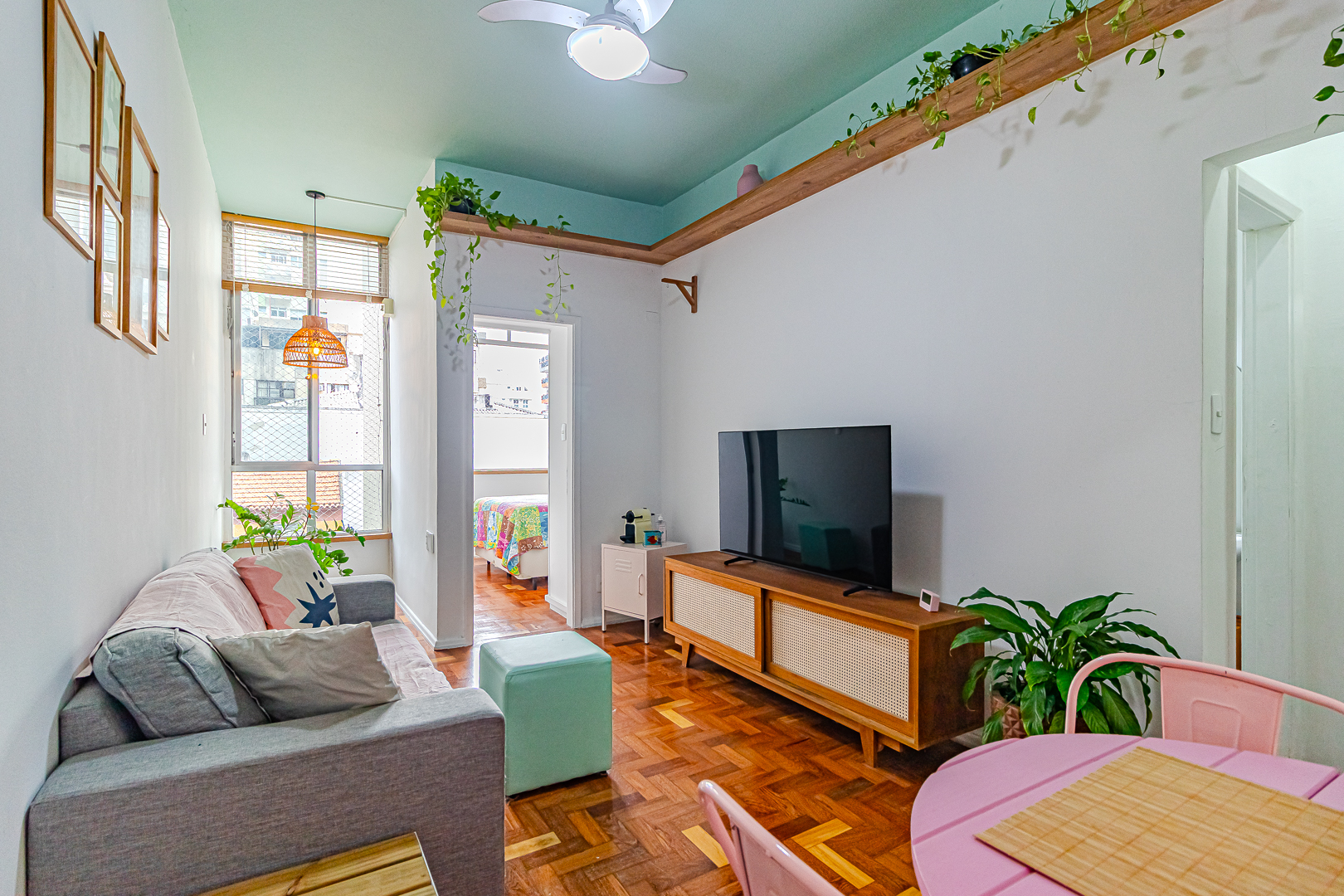 A sala é clara e arejada e, assim como o resto do apê, conta com um belo piso de tacos.