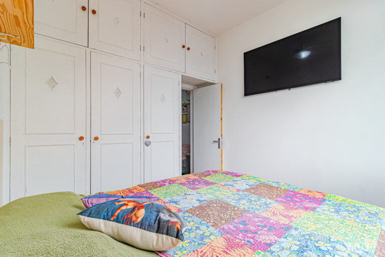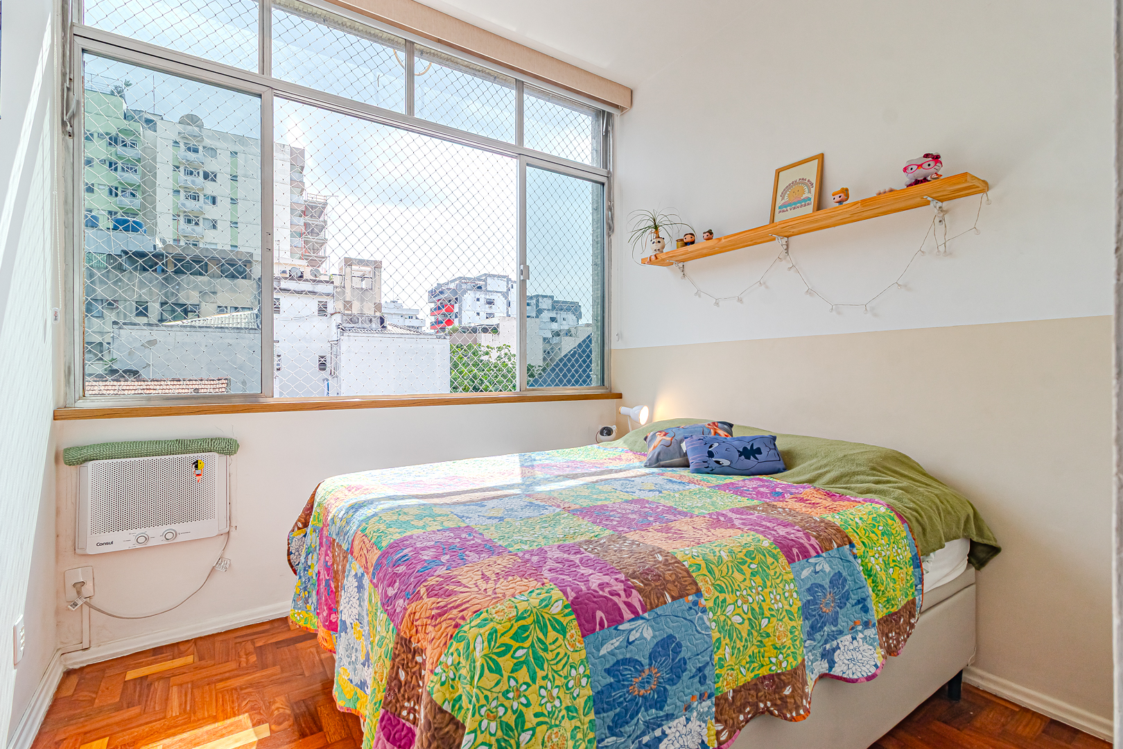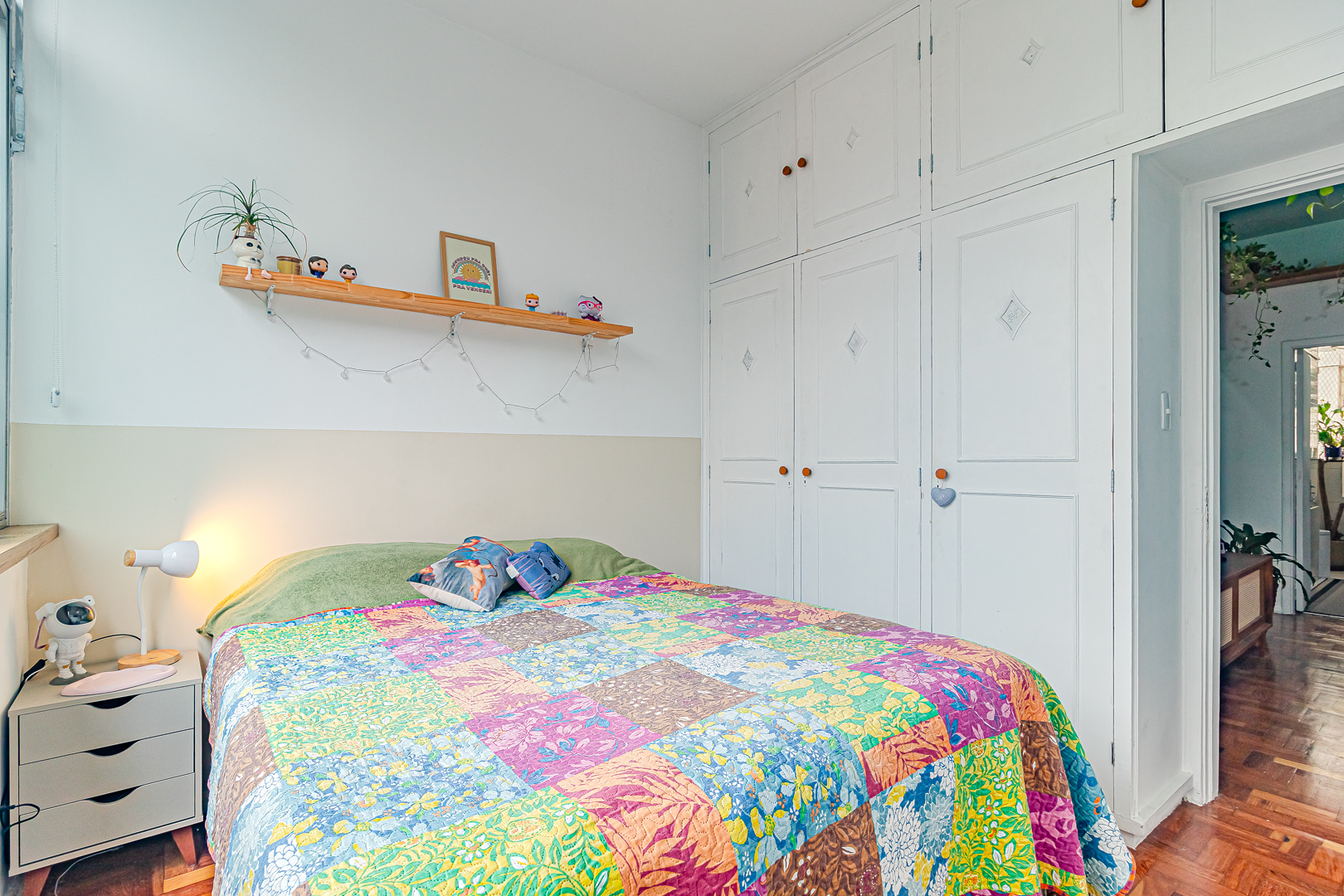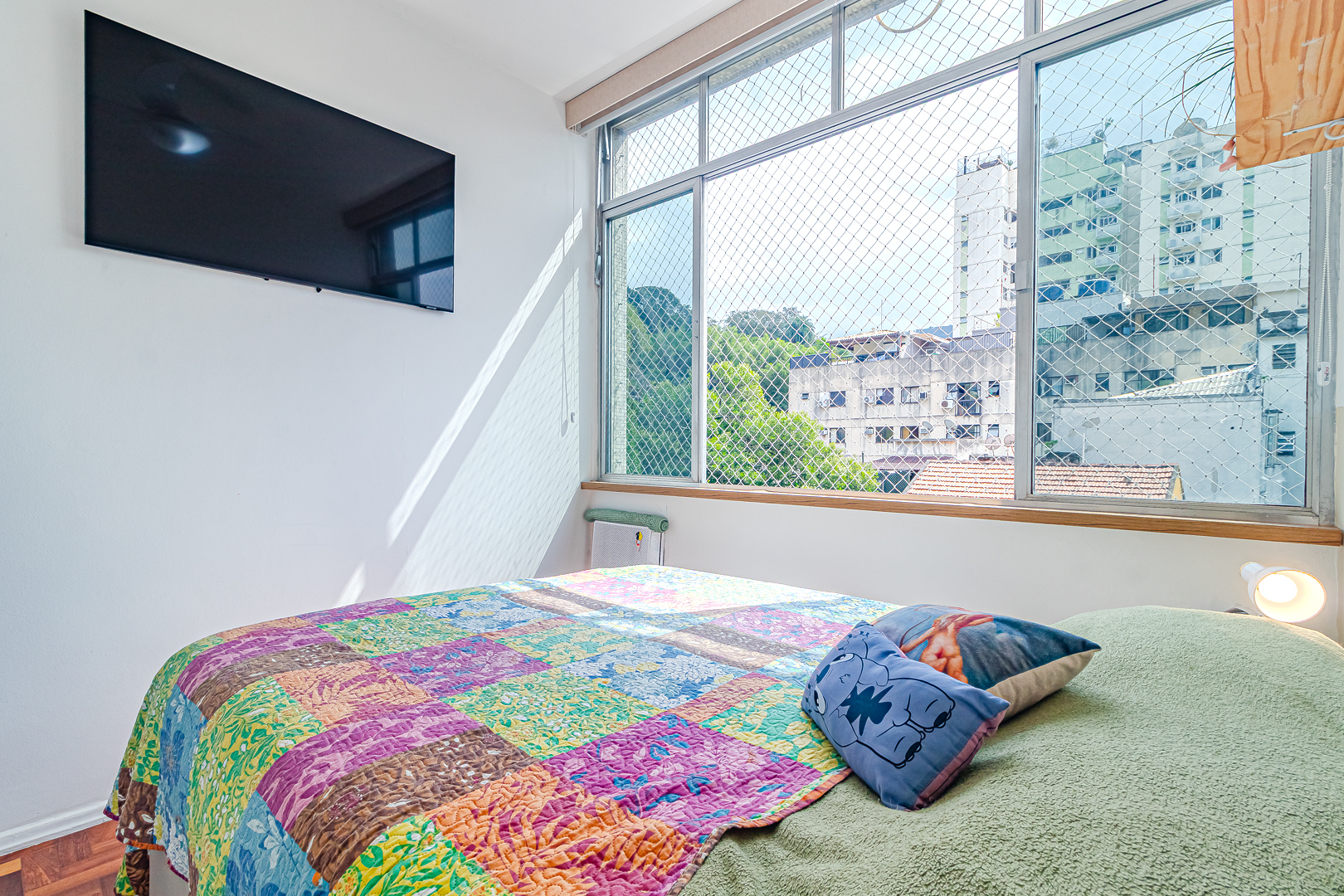 O quarto tem armários embutidos e vista livre, de onde se pode ver a pontinha do Cristo Redentor.