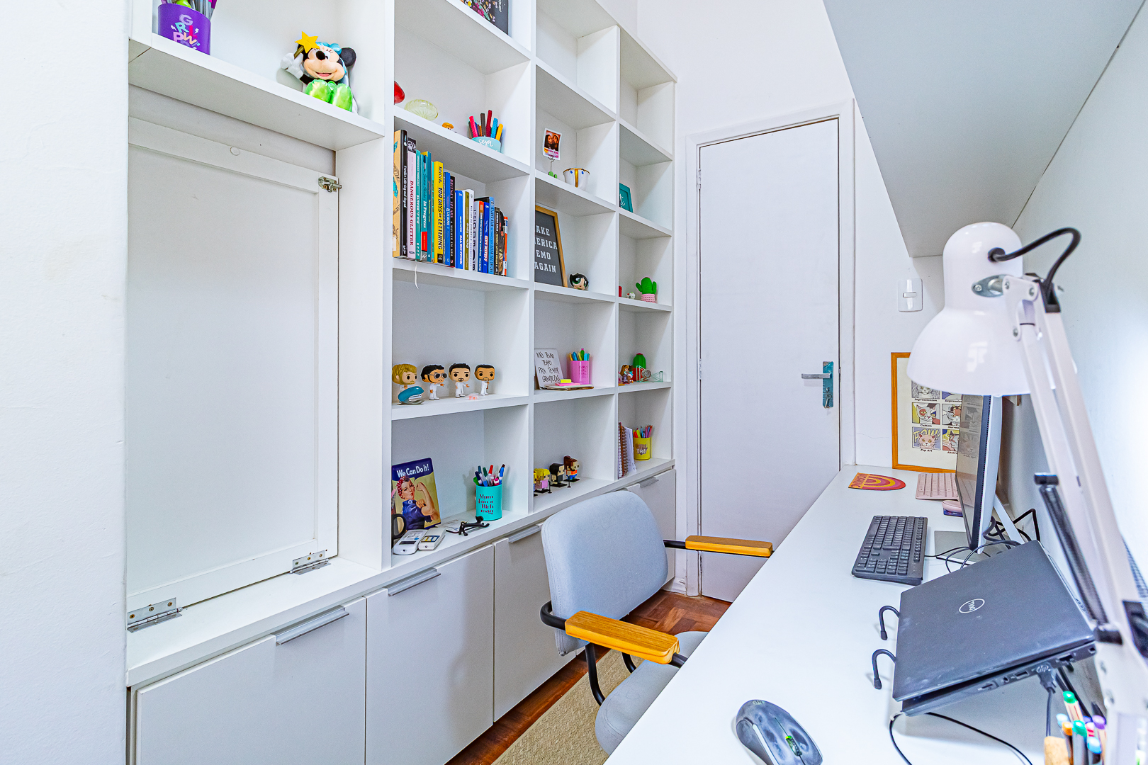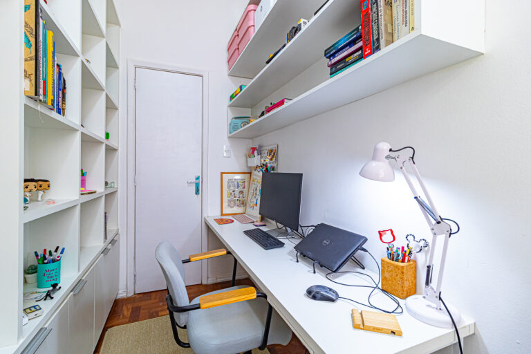 A dependência foi revertida para um ótimo escritório, de onde se pode trabalhar confortavelmente pois, além de iluminado, conta com um aparelho de ar-condicionado tipo split.