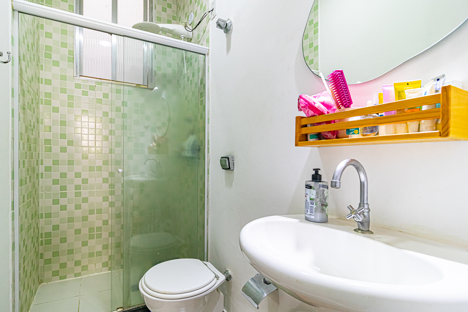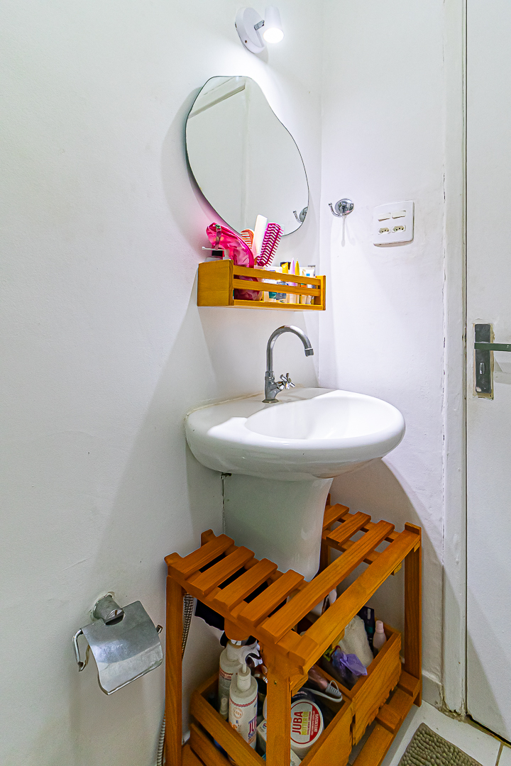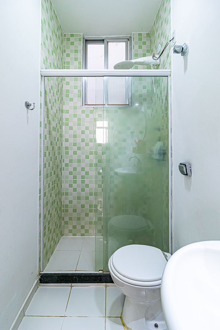 O banheiro é espaçoso para um apê deste tamanho, contando com ventilação natural e chuveiro elétrico.