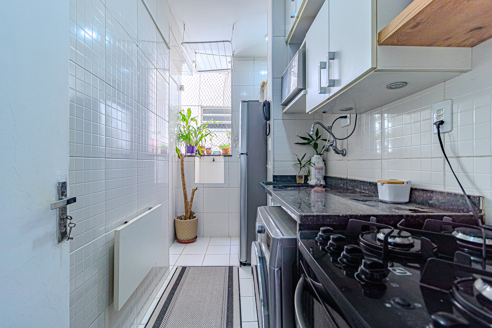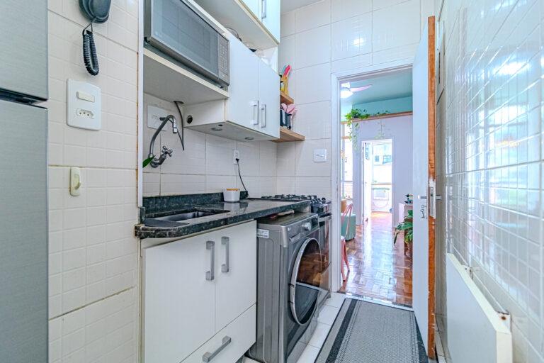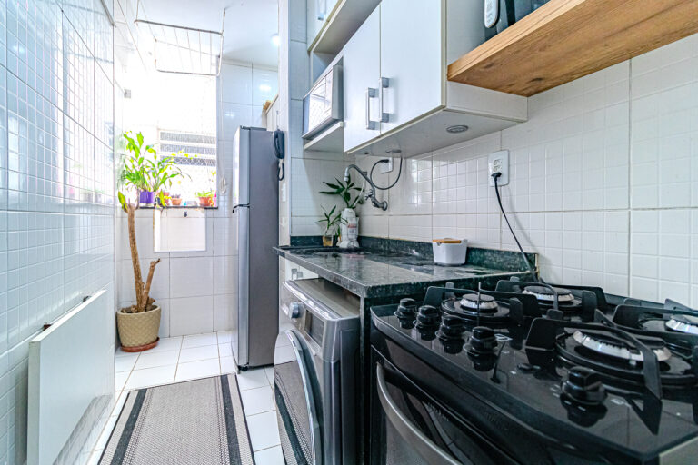 A cozinha é compacta mas bastante funcional, tendo vários armários e cantinhos, onde os eletrodomésticos se encaixam perfeitamente. Conta ainda com uma pequena área de serviço.