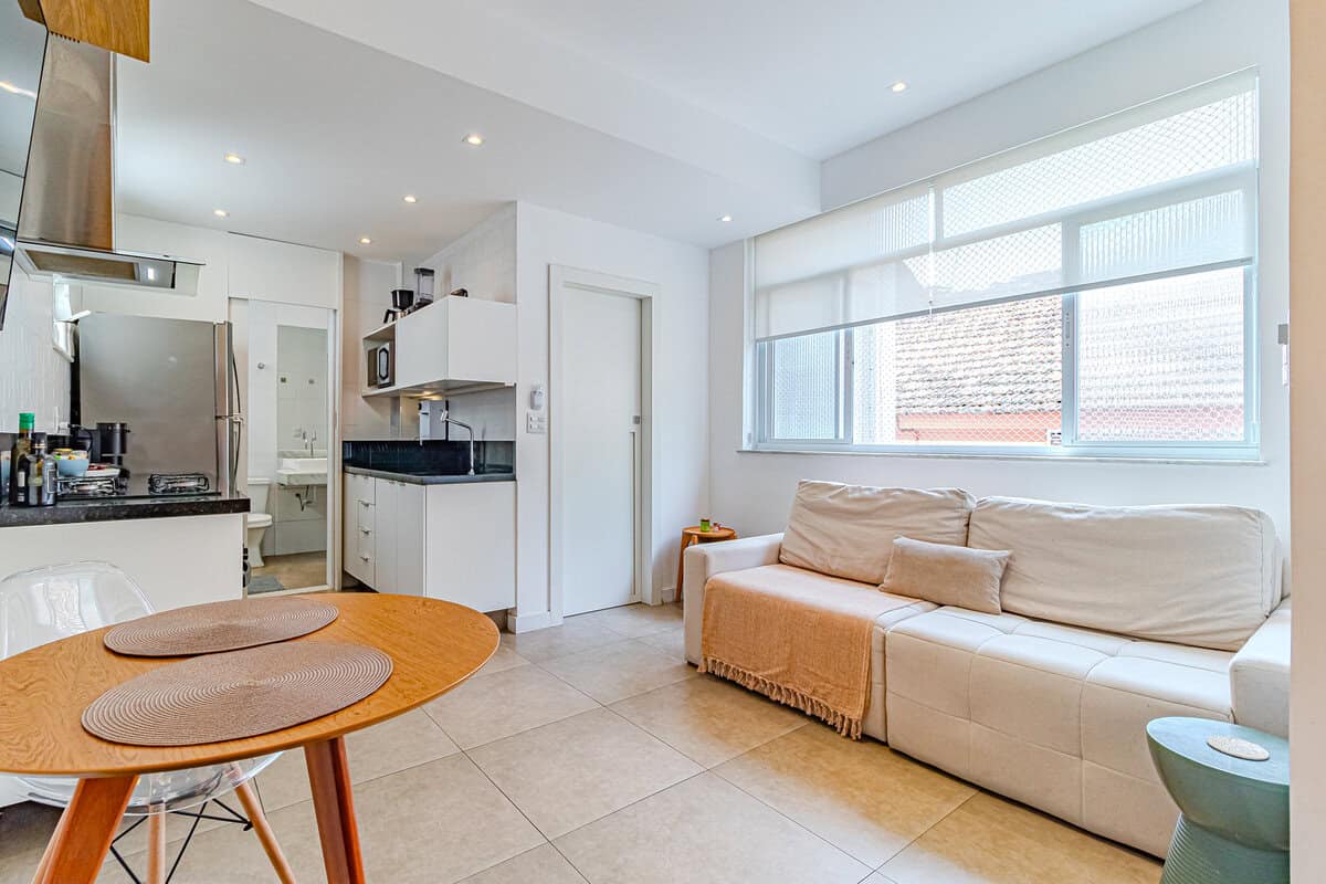 O imóvel de 41m² fica localizado na Rua Maestro Francisco Braga, no cantinho mais aprazível de Copa.