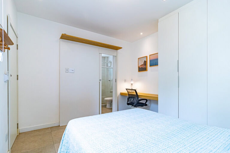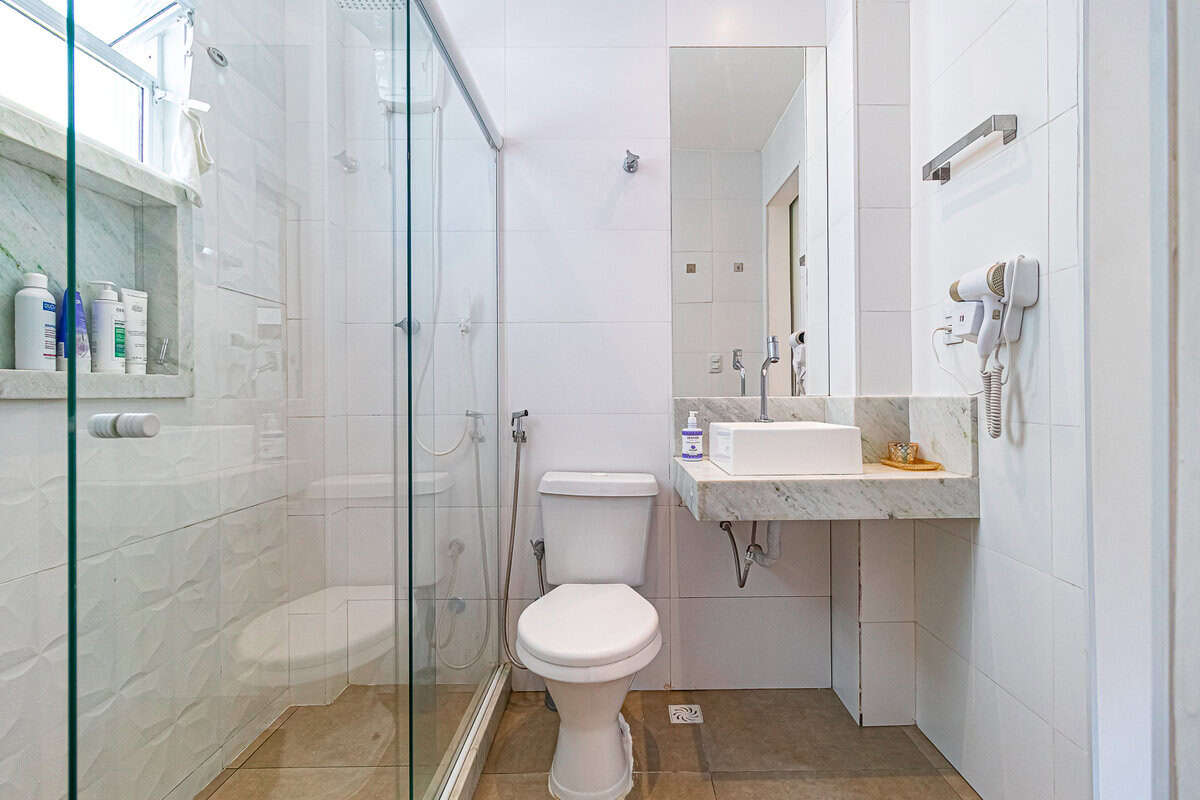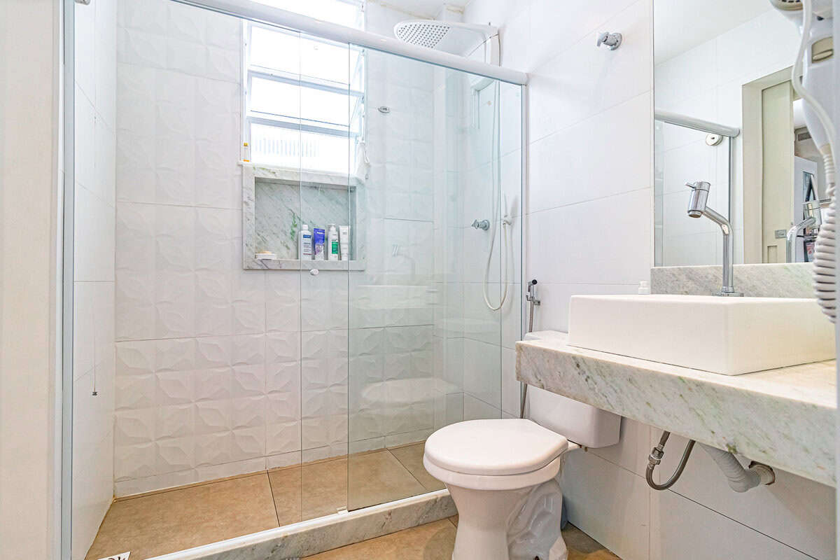 O banheiro tem porta para os 2 lados, deixando o apê com 1 suíte canadense.