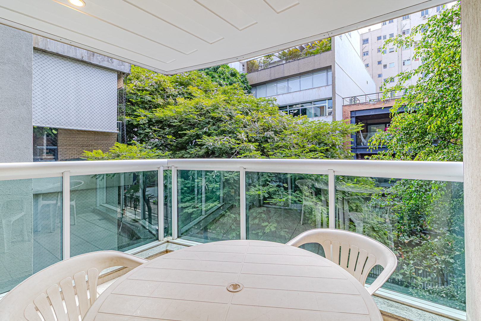 A sala e a cozinha formam praticamente um único ambiente, claro e arejado. Ambos se comunicam com uma gostosa varanda na altura da copa das árvores.