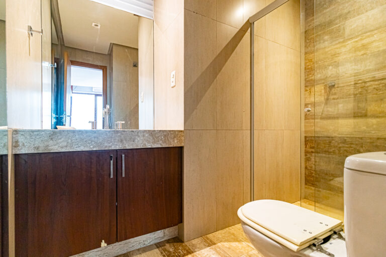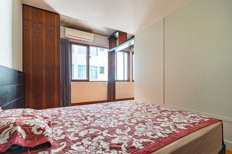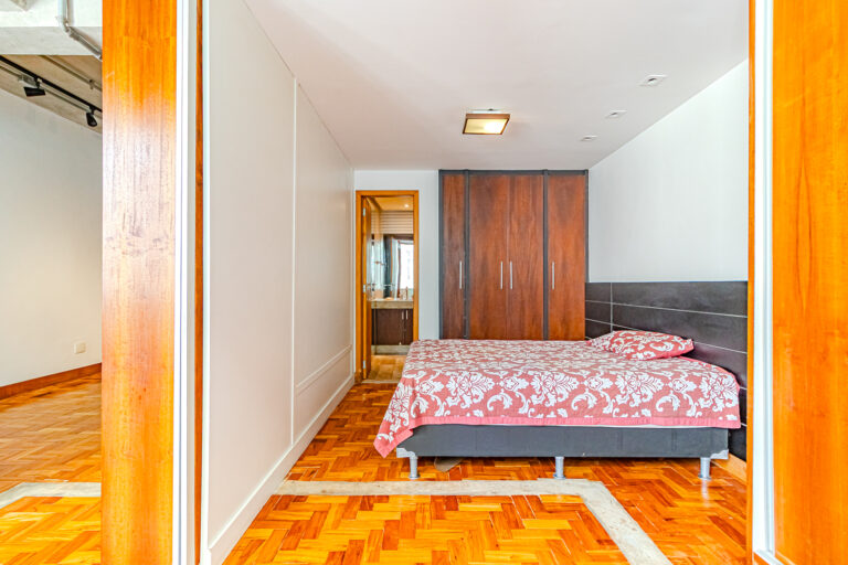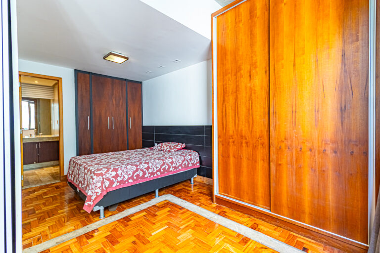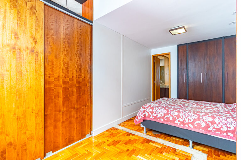 Originalmente com 2 quartos, os proprietáros fizeram a obra para deixar os ambientes mais espaçosos. Desta forma atualmente há uma sala de estar qua fica integrada a uma suíte bem grande, repleta de armários planejados.