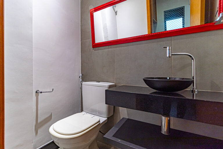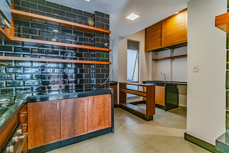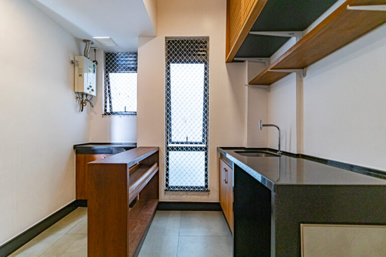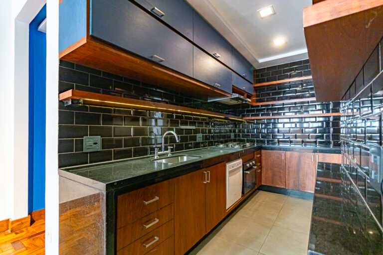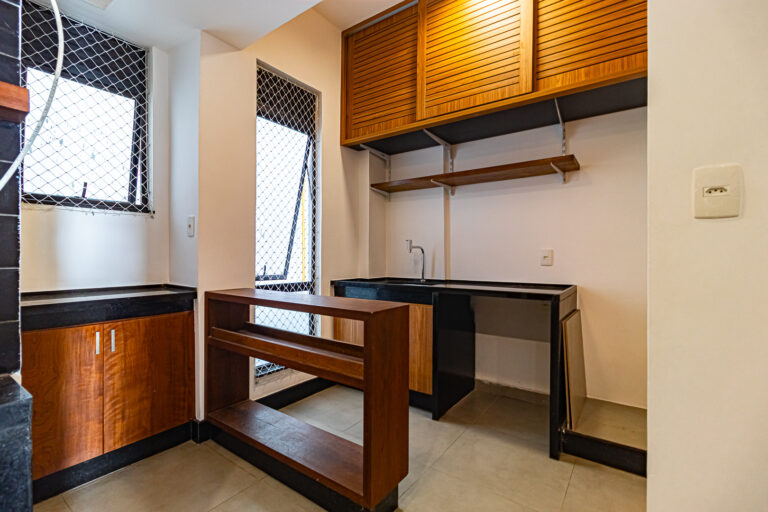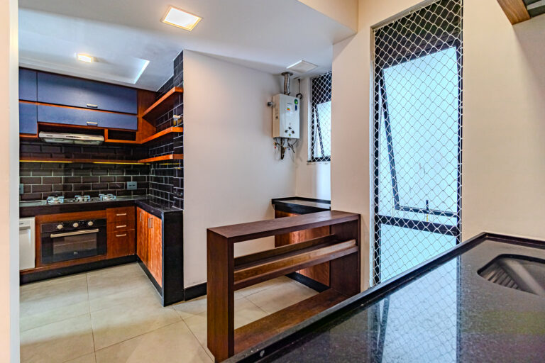 A cozinha é super moderna e tem um belo projeto de marcenaria. Conta ainda com uma ampla área de serviço e um lavabo para atender as visitas.