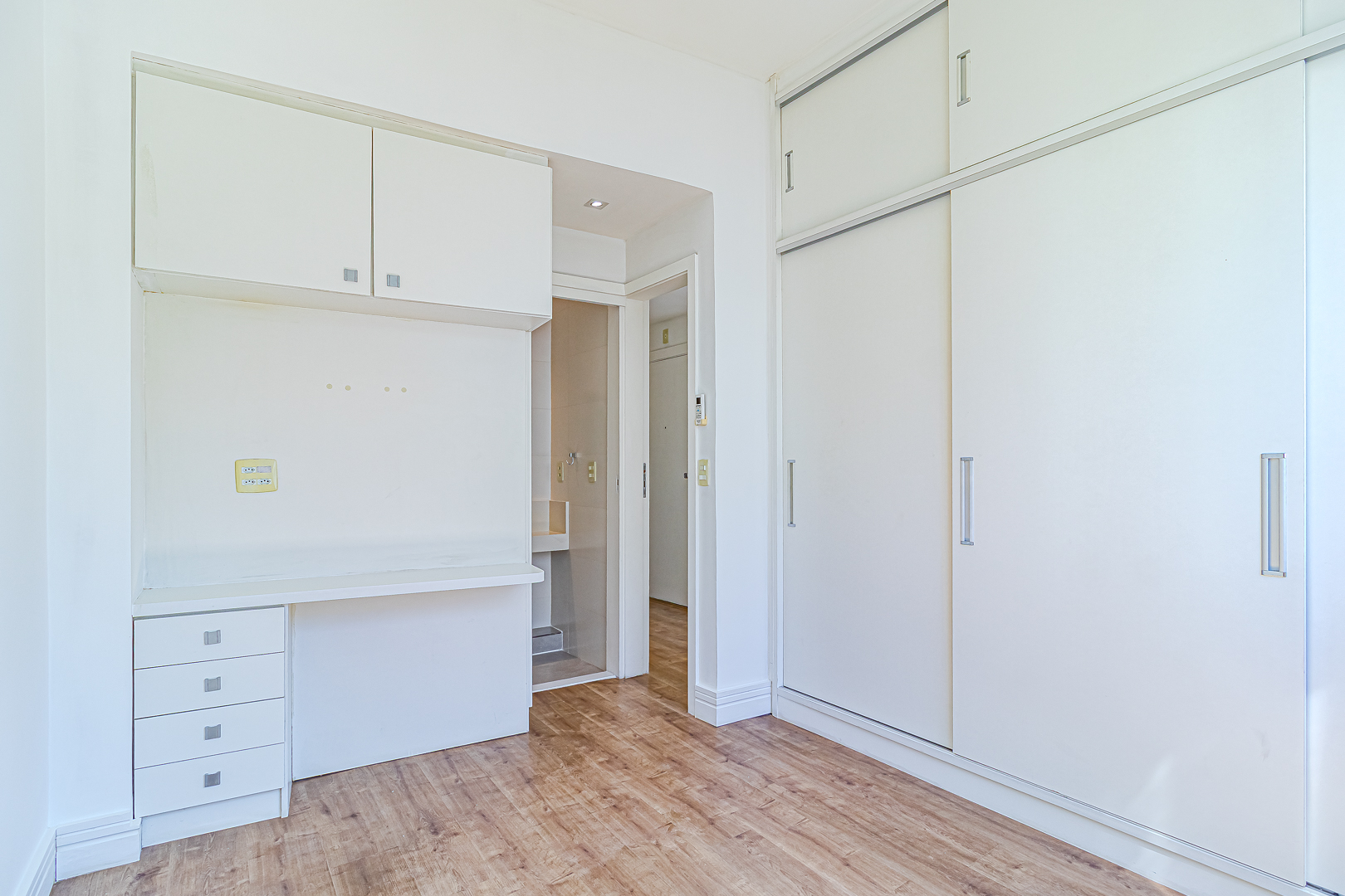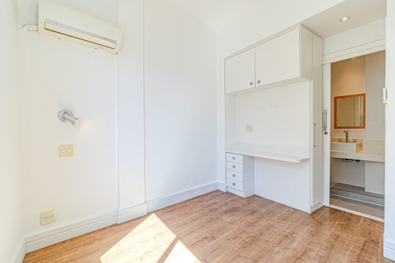 A suíte, como o resto do imóvel, conta com marcenaria planejada e tem um cantinho para trabalhar em home office.