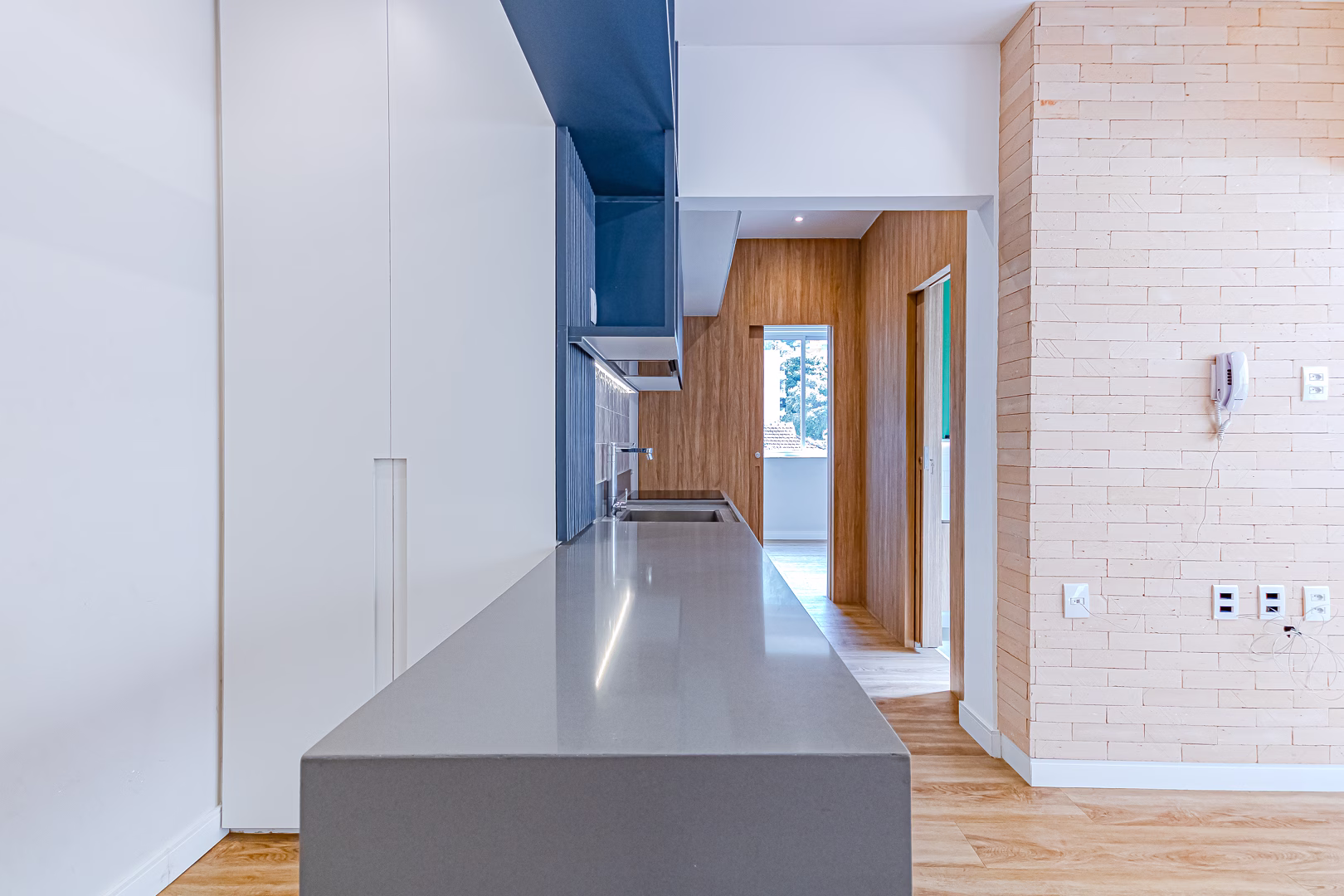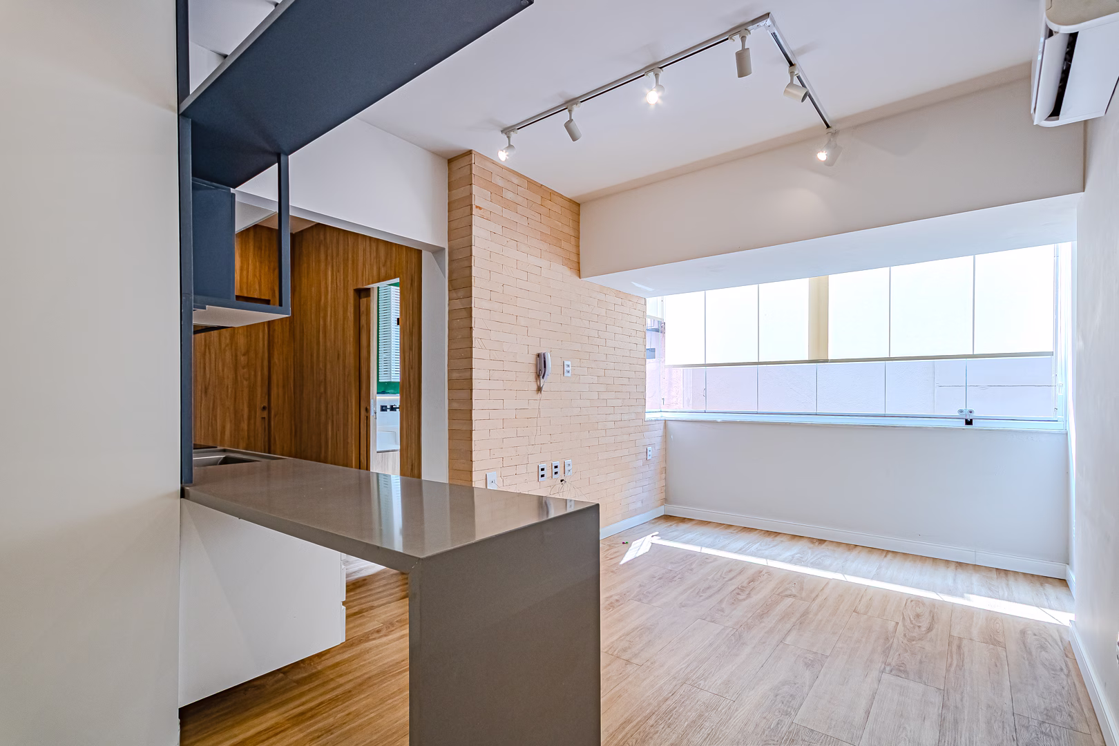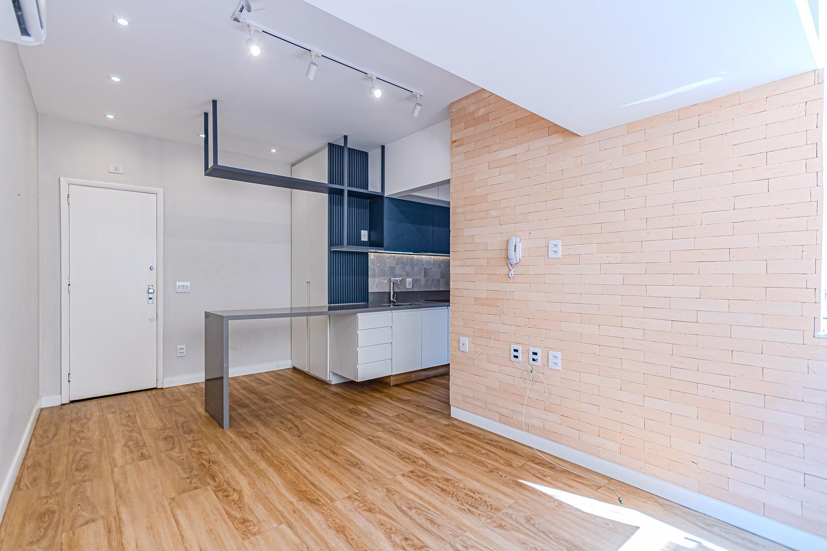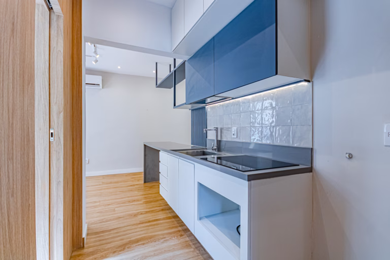 A sala é integrada à cozinha, deixando o ambiente mais amplo e acolhedor.
