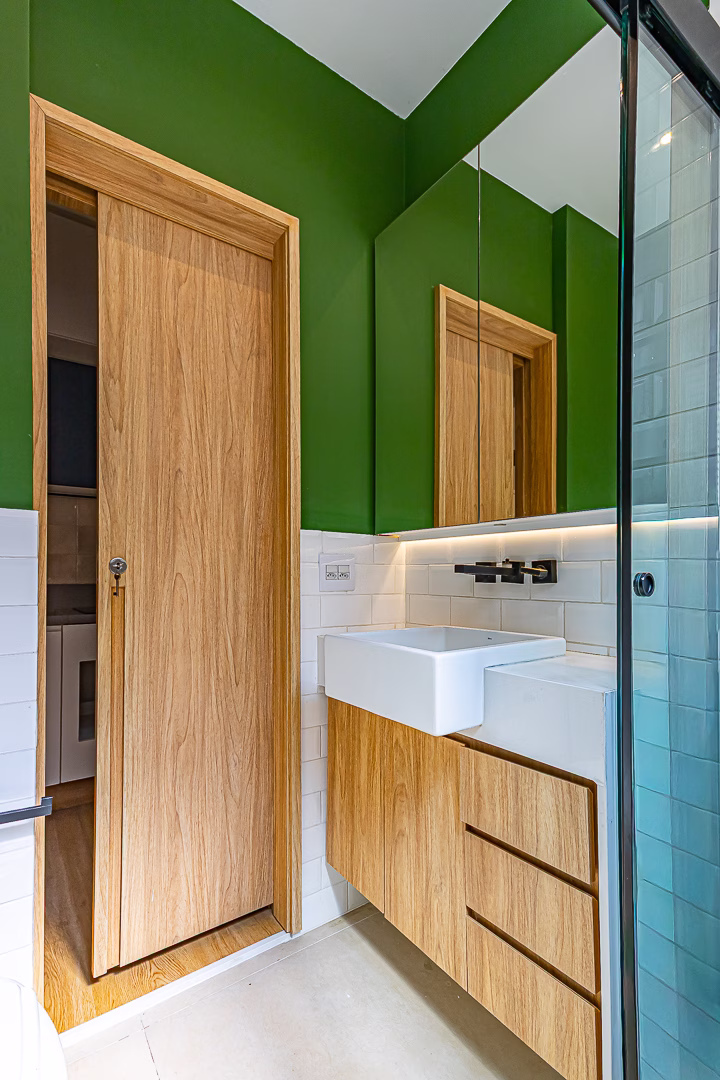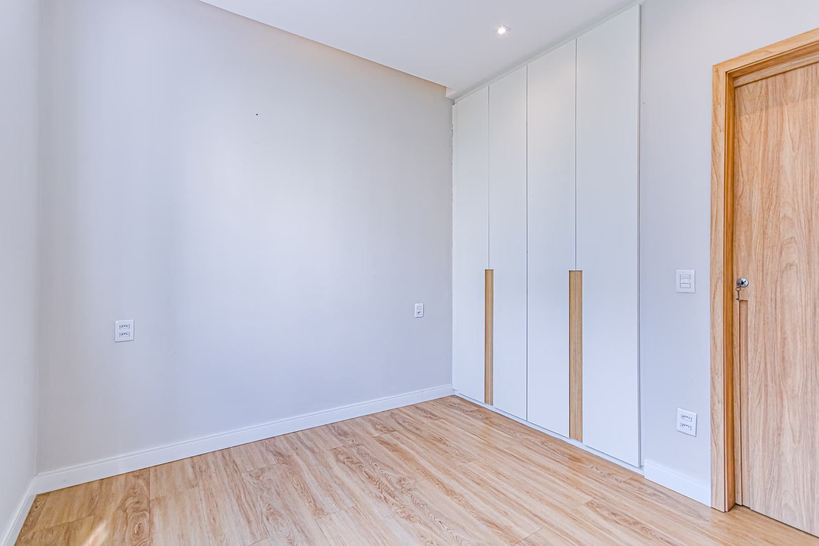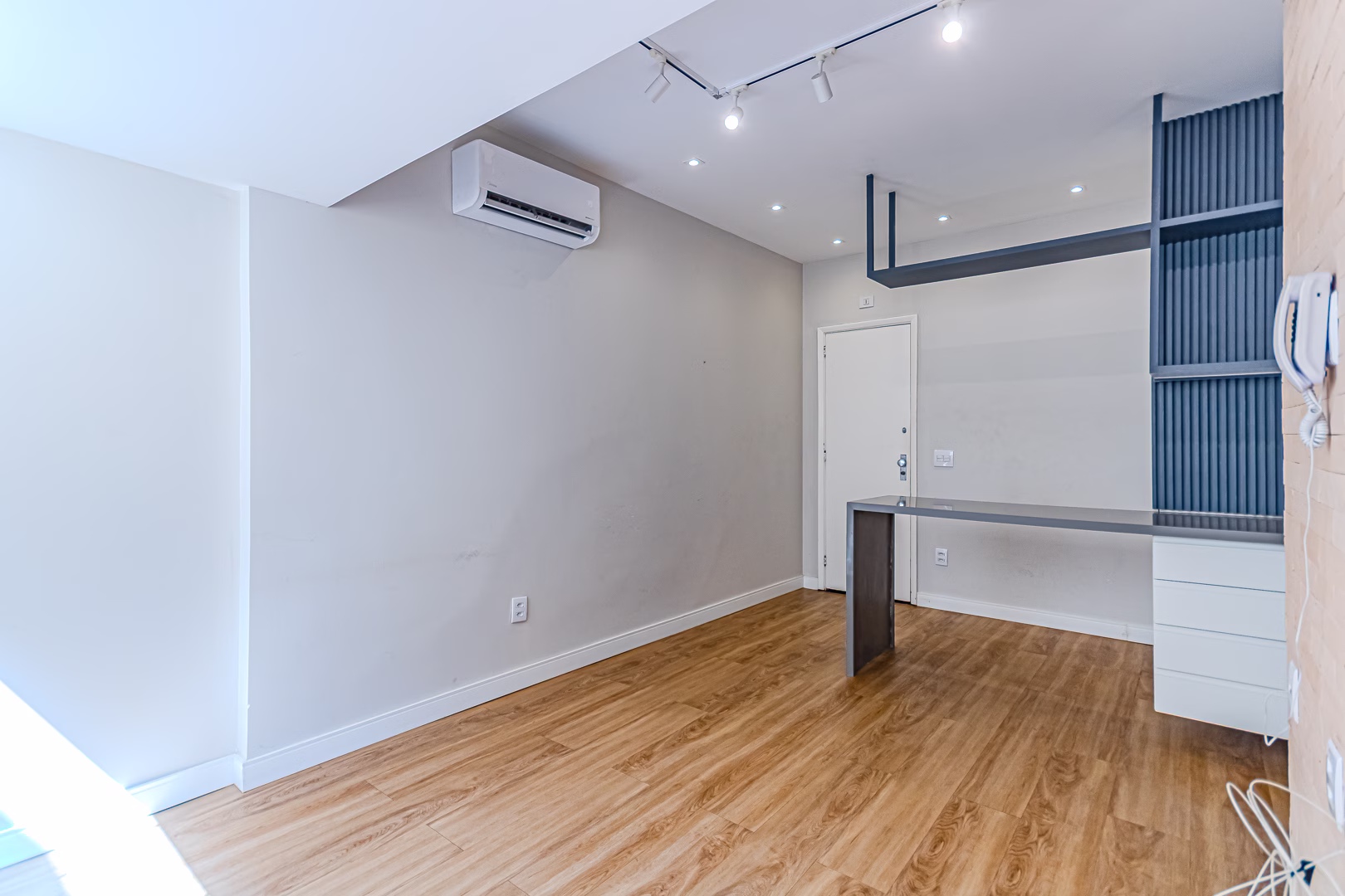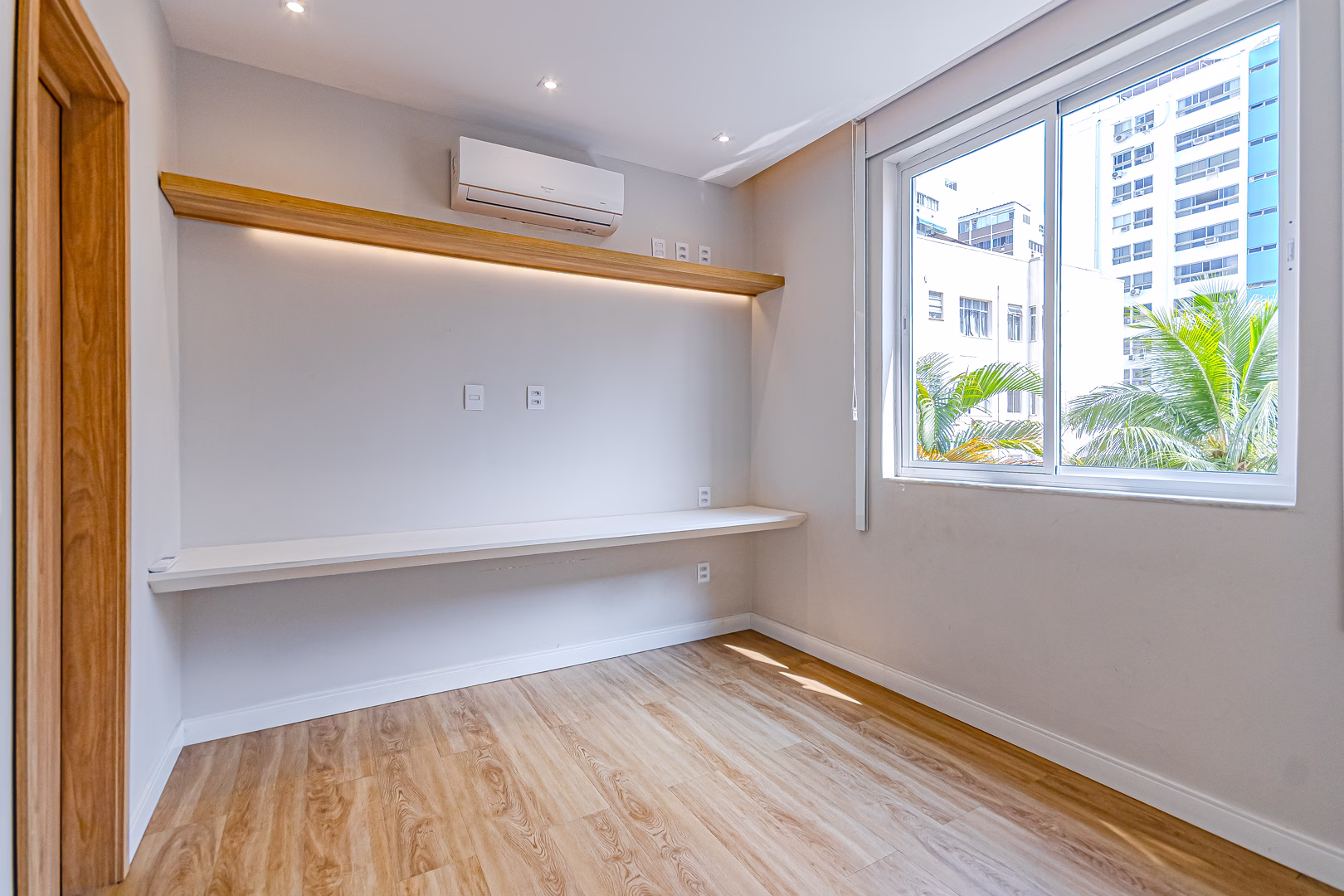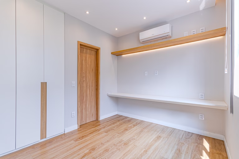 O quarto, assim como o resto do apartamento, tem um belo projeto de marcenaria e aparelho de ar-condicionado tipo split.