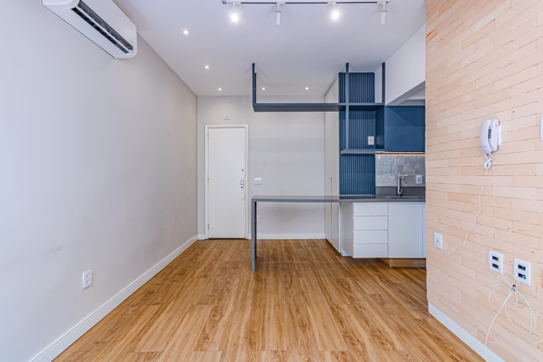 Em um simpático predinho, colado no Shopping da Gávea, fica este aconchegante apartamento quarto e sala, prontinho para você entrar e morar.