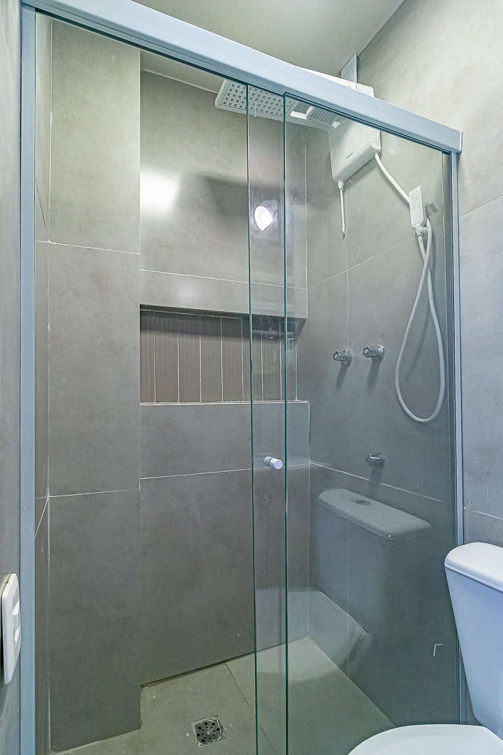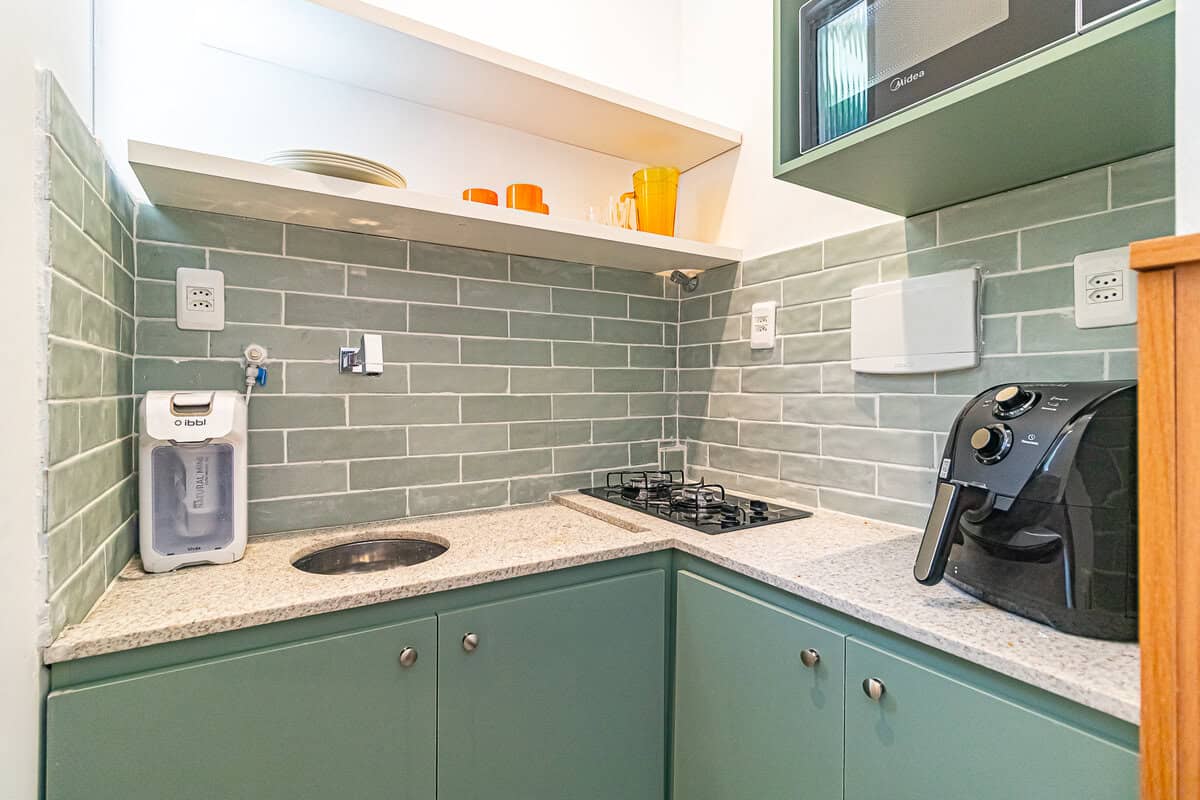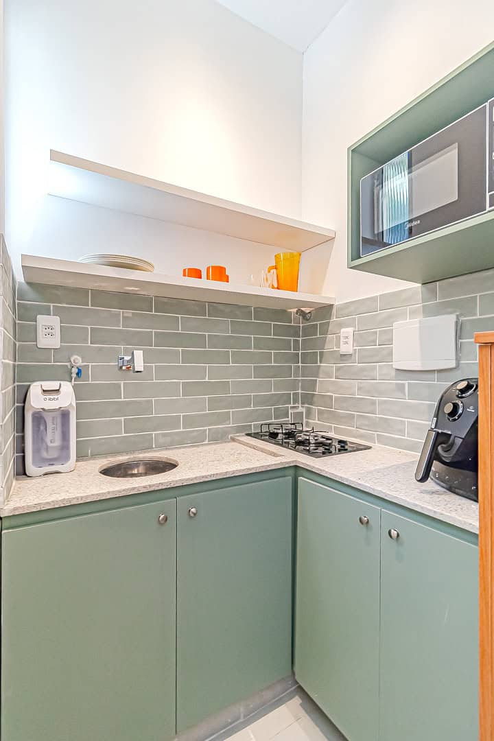 O projeto foi pensado para aproveitar todos os cantinhos e deixar os ambientes confortáveis e bem divididos. Difícil acreditar que um apê de 23m² tem “quarto”, “banheiro”, “cozinha” e “escritório”. Impressionante, né?