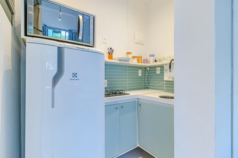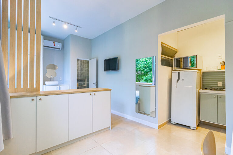 O projeto foi pensado para aproveitar todos os cantinhos e deixar os ambientes confortáveis e bem divididos. Difícil acreditar que um apê de 23m² tem “quarto”, “banheiro”, “cozinha” e “escritório”. Impressionante, né?