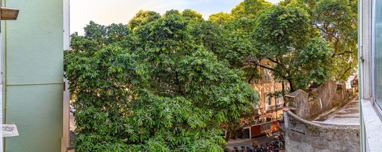 O apartamento fica de frente para a copa das árvores, que trazem frescor e privacidade.