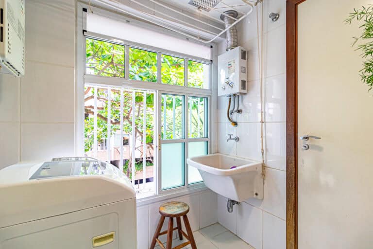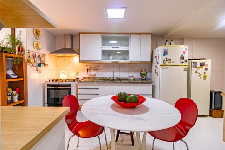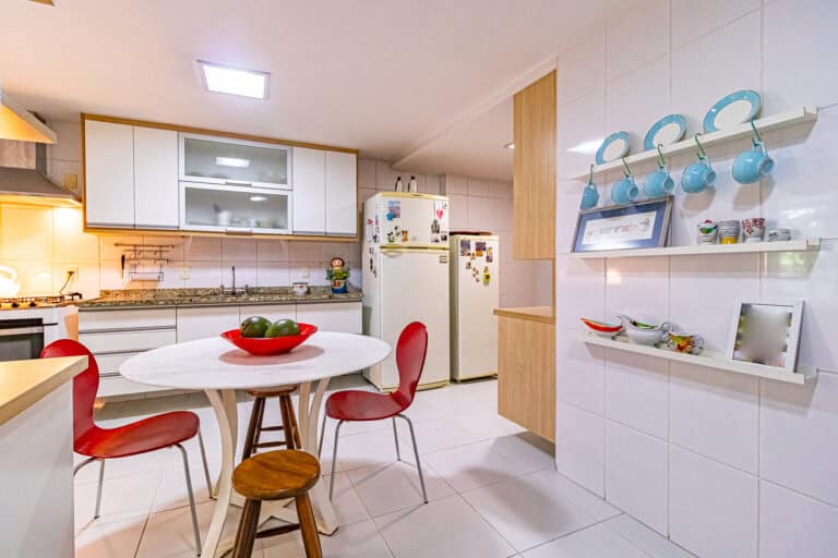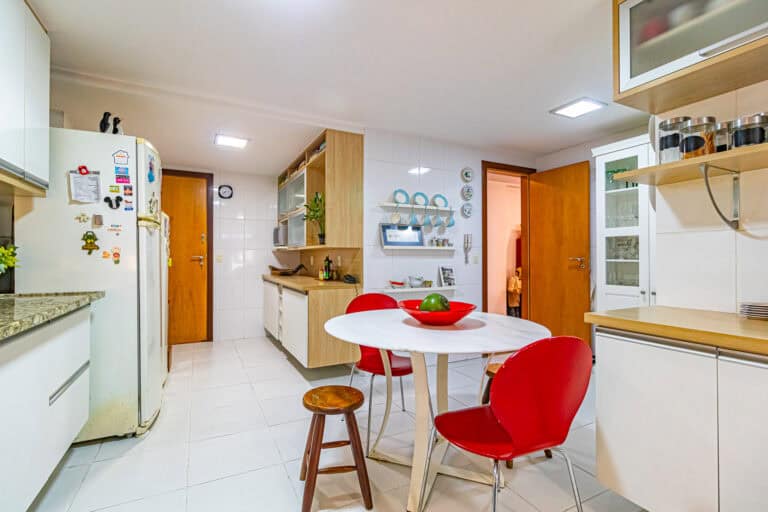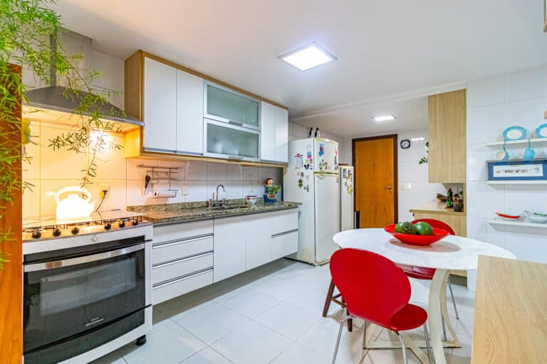 A cozinha é muito confortável. Me arrisco a dizer que é o lugar onde as pessoas ficam lá batendo papo e comendo quando tem festa no apê. Conta ainda com área de serviço, WC e uma ótima dependência.