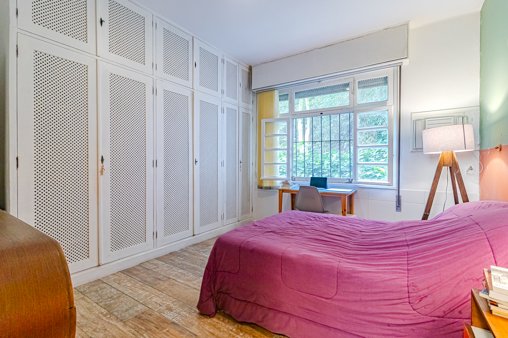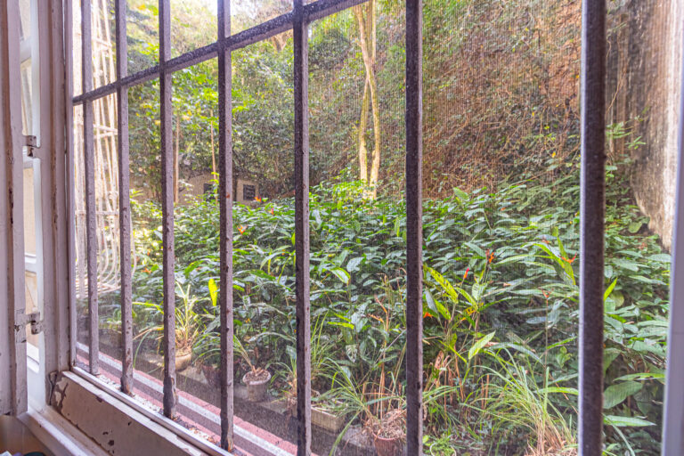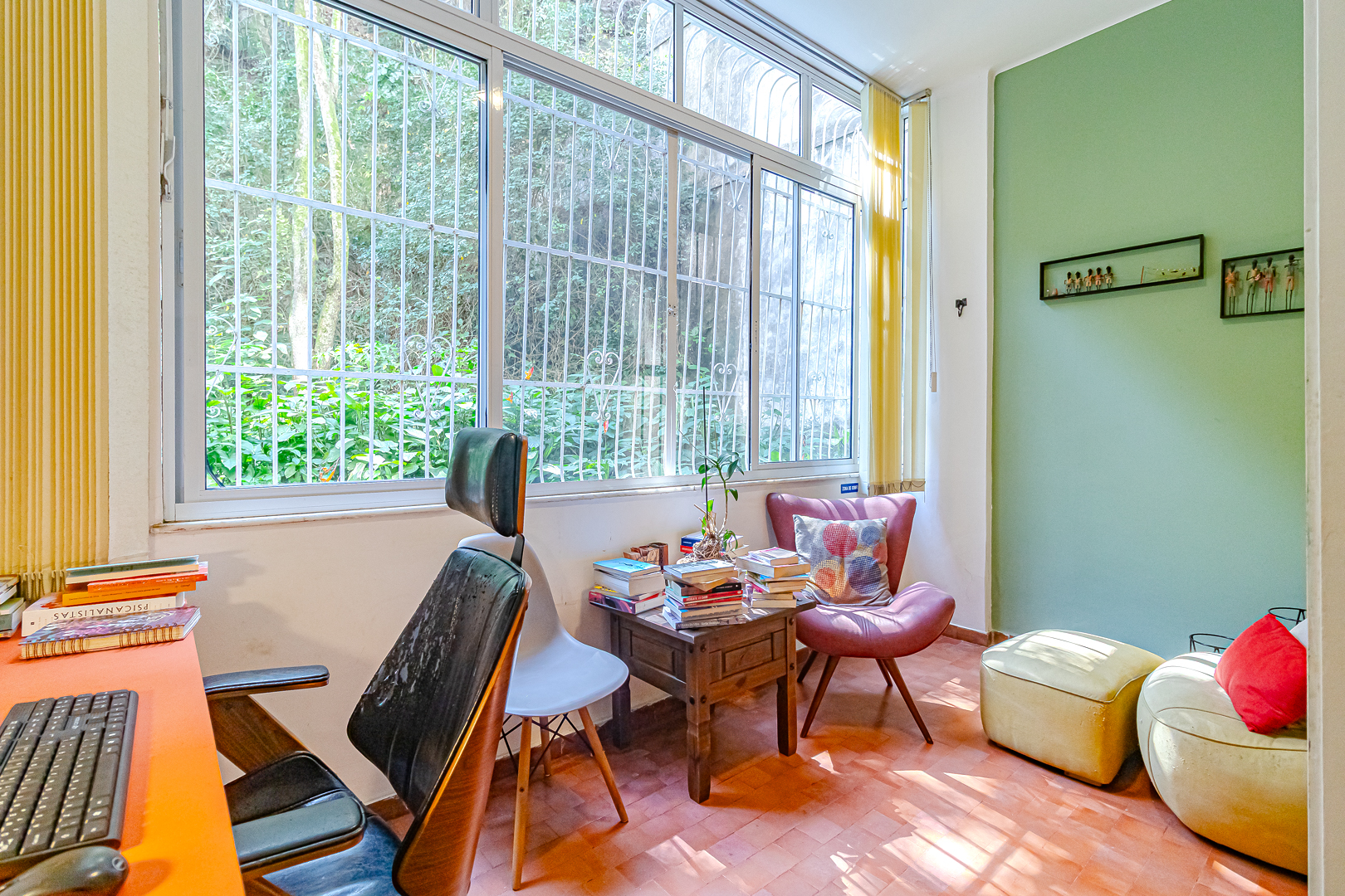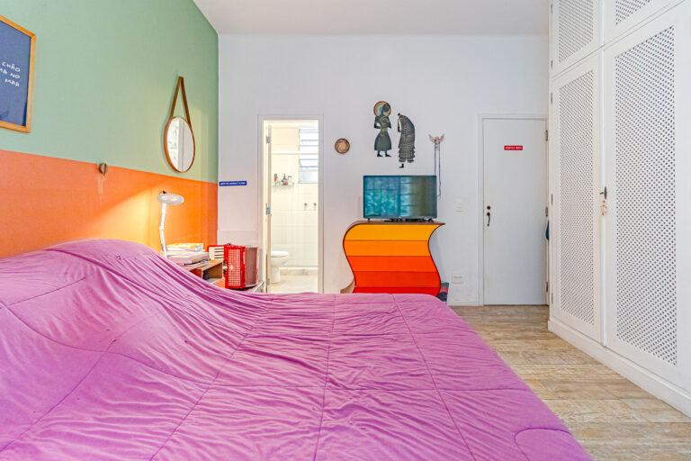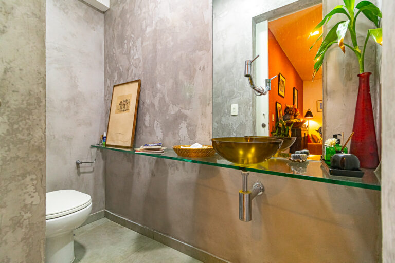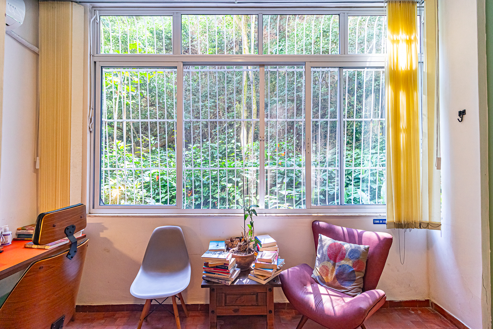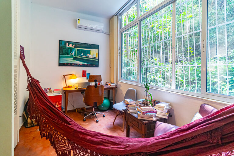 A área íntima é composta por 2 quartos, sendo 1 suíte e mais um lavabo. A suíte tem armários embutidos e um banheiro com ventilação natural. O 2º quarto é usado pela proprietária para fazer atendimentos, já que ela é psicóloga. Conta ainda com uma varanda interna que, assim como a suíte, tem vista para a mata.