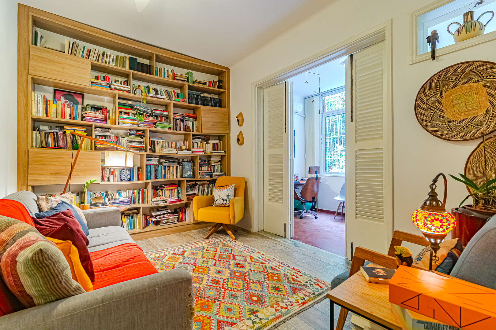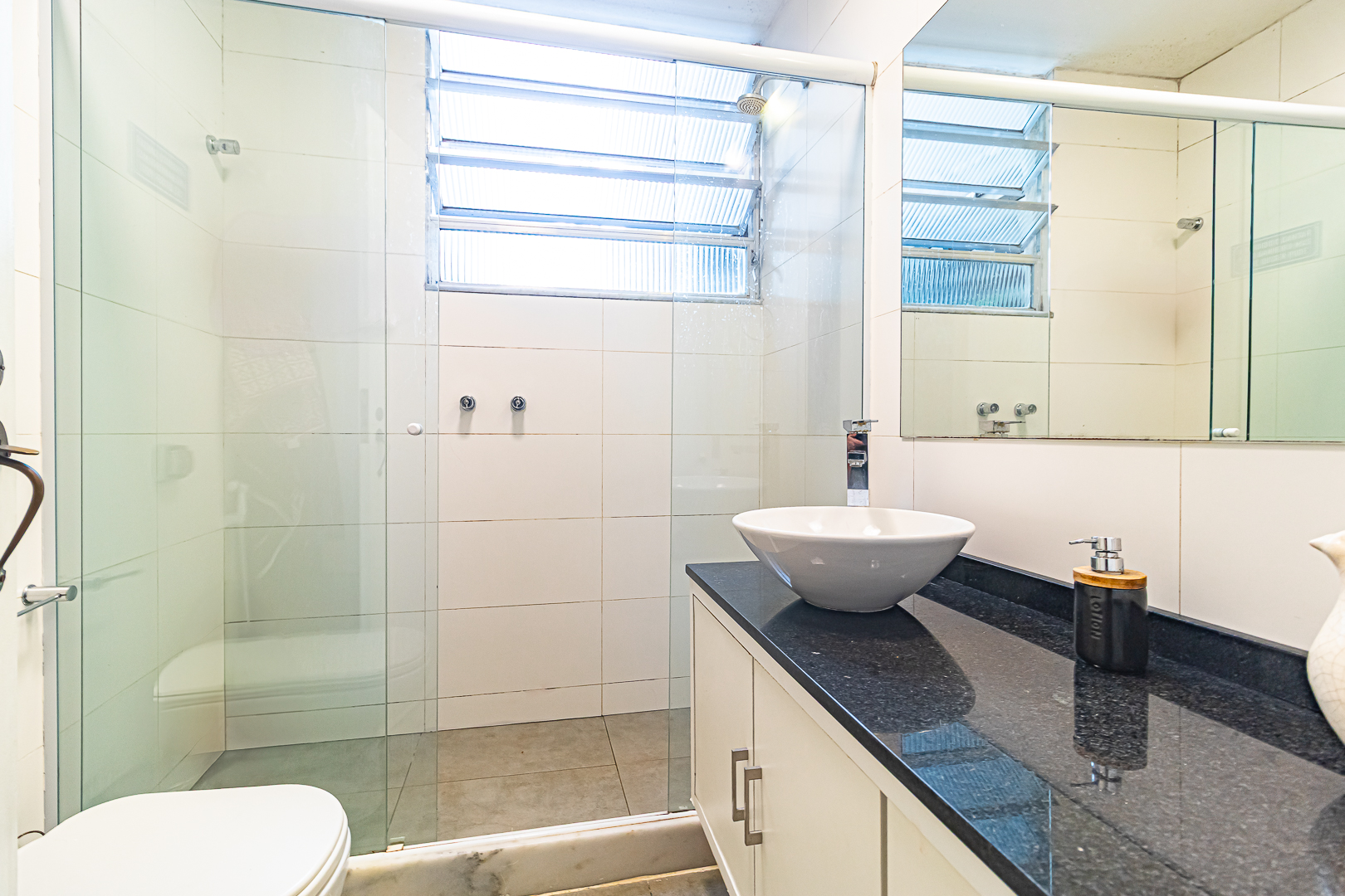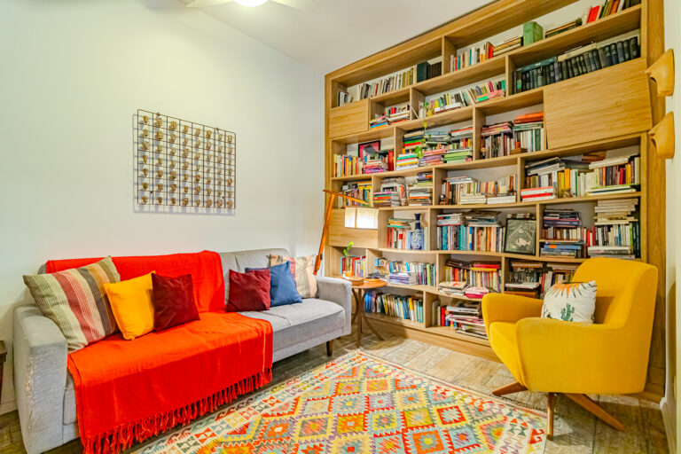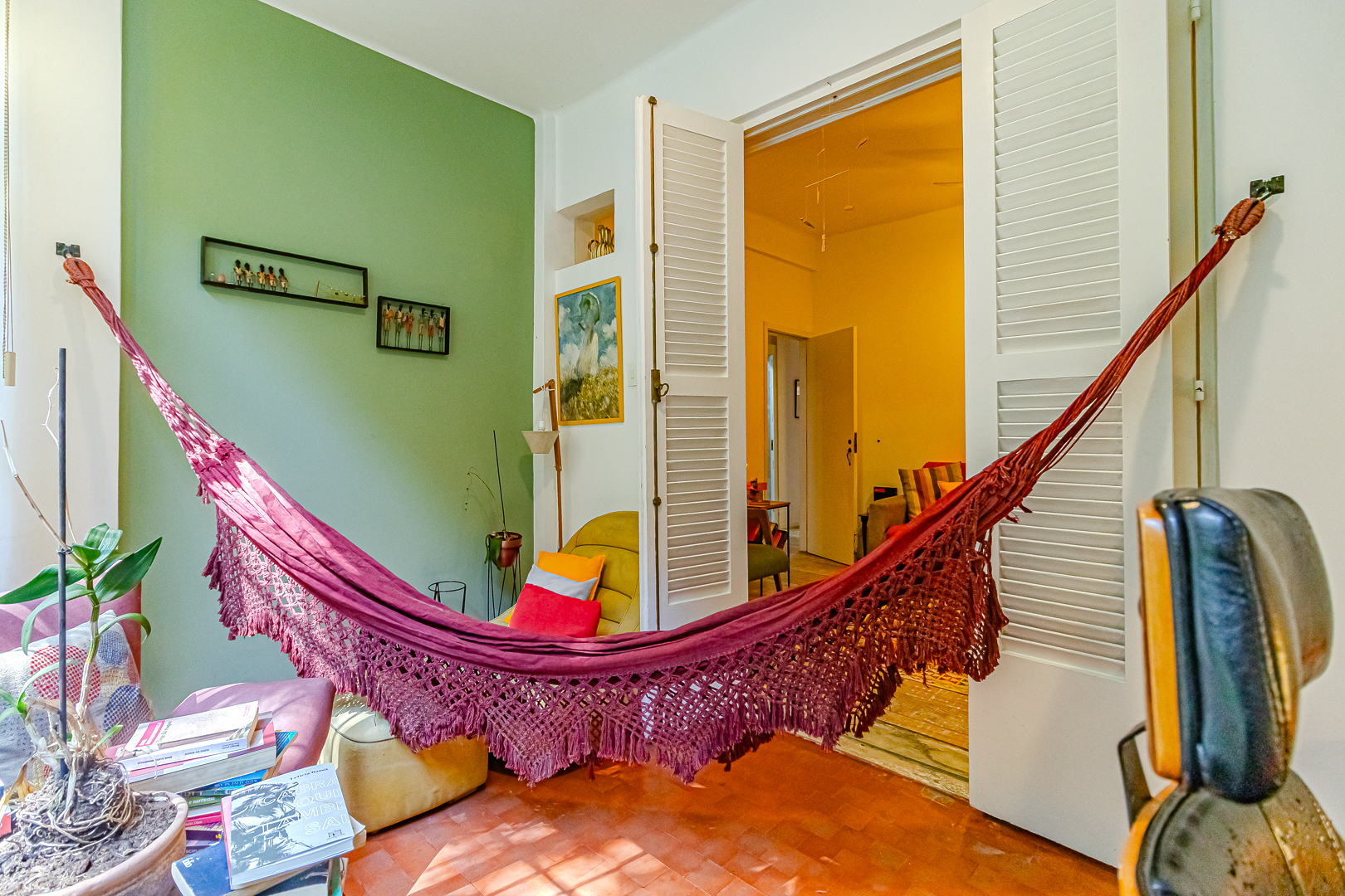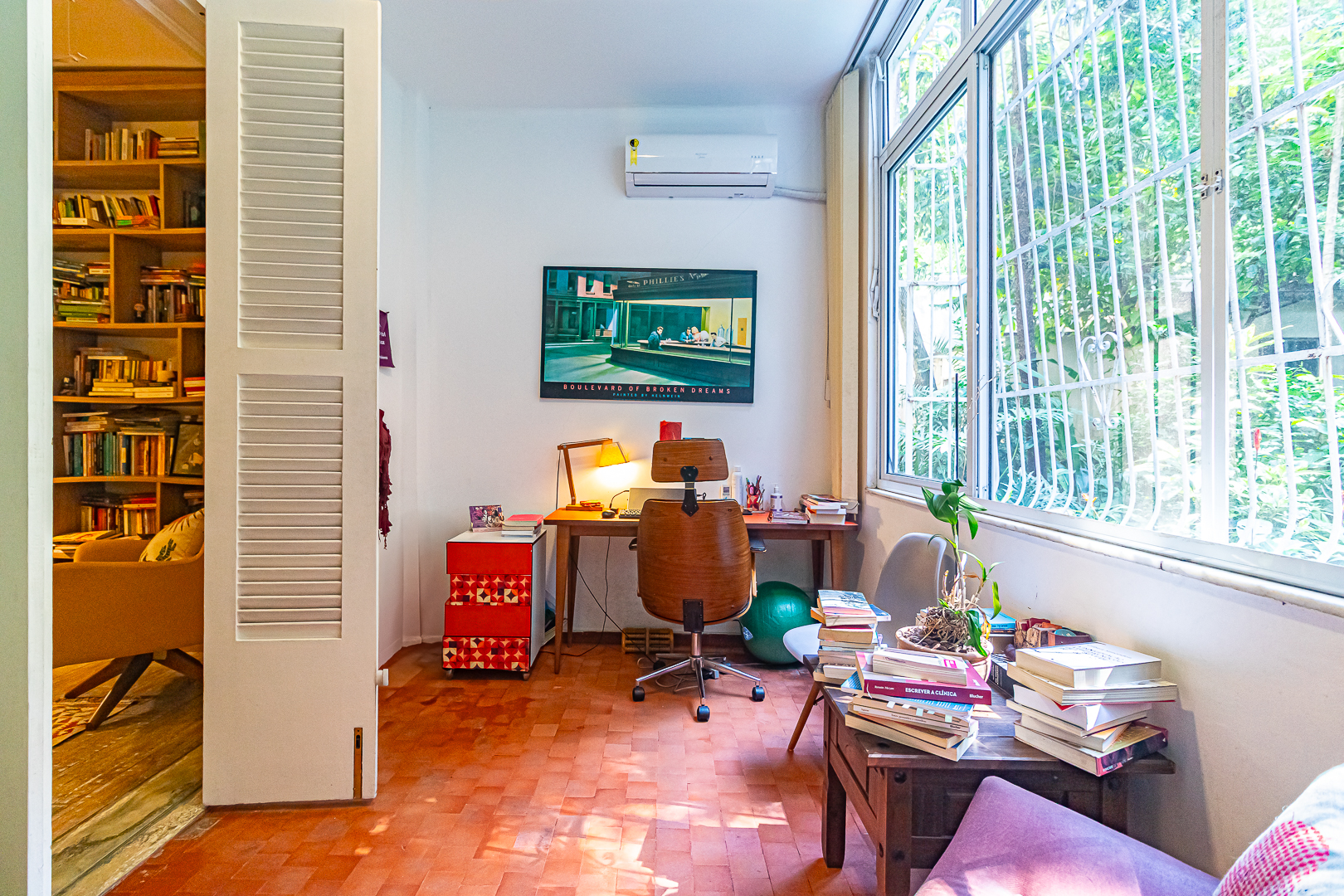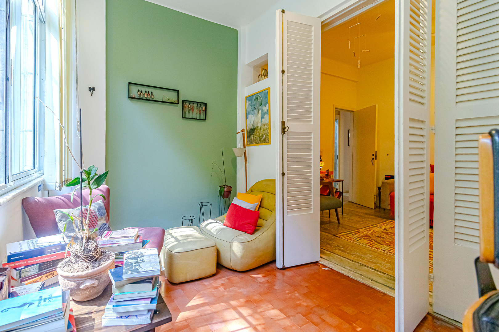 A área íntima é composta por 2 quartos, sendo 1 suíte e mais um lavabo. A suíte tem armários embutidos e um banheiro com ventilação natural. O 2º quarto é usado pela proprietária para fazer atendimentos, já que ela é psicóloga. Conta ainda com uma varanda interna que, assim como a suíte, tem vista para a mata.