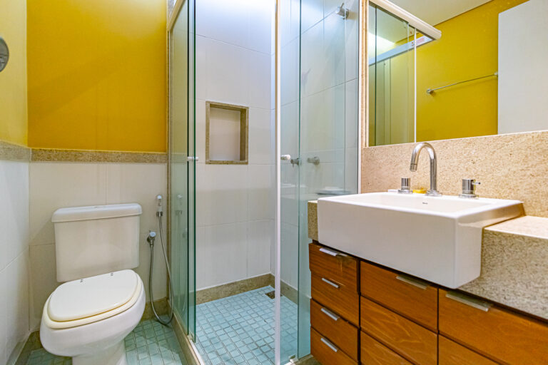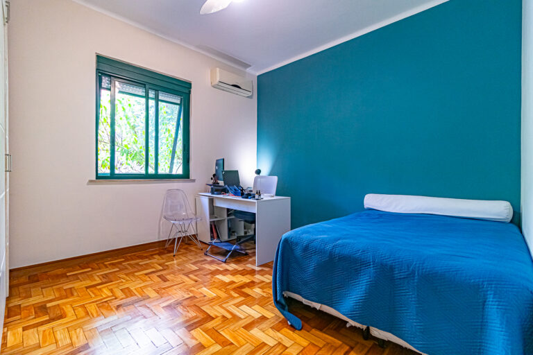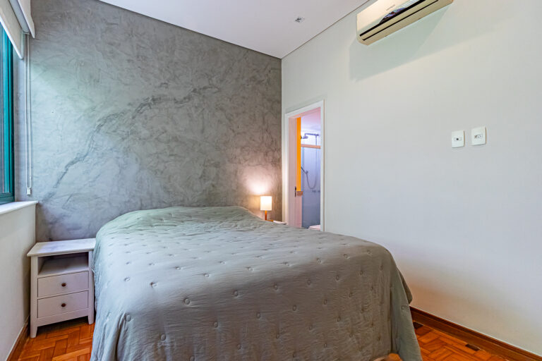 A área íntima tem 2 quartos, sendo 1 suíte e mais 1 banheiro social. Todos os cômodos contam com marcenaria planejada e aparelhos de ar-condicionado tipo split.
