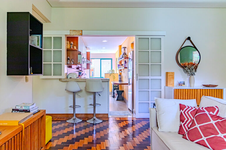 A sala é bastante clara e conta com dois ambientes. As árvores em frente, que trazem privacidade, e o belíssimo chão de tacos, merecem um destaque especial.