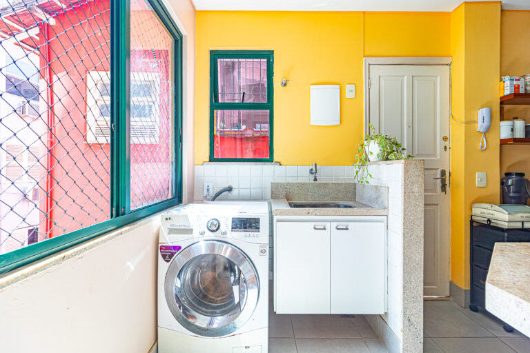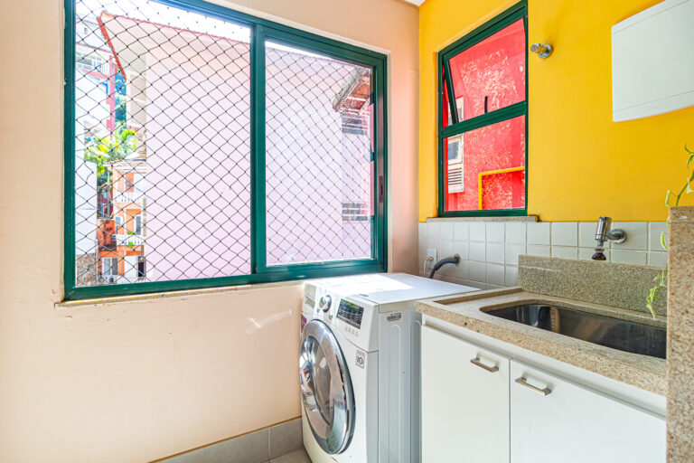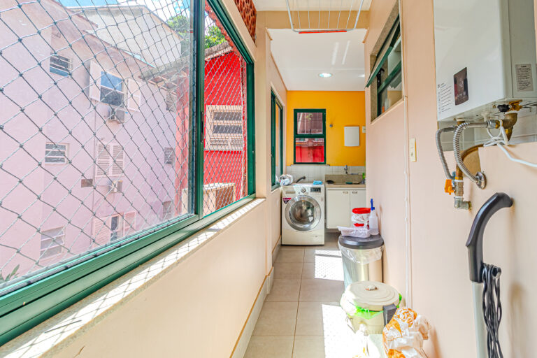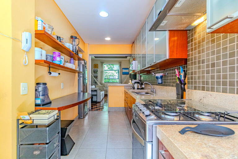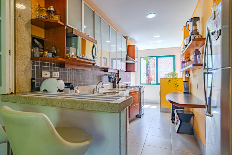A cozinha é aberta para a sala, mas pode ser fechada por uma engenhosa porta de correr. Além disso é muito iluminada e conta com uma boa área de serviço, dependência e WC.