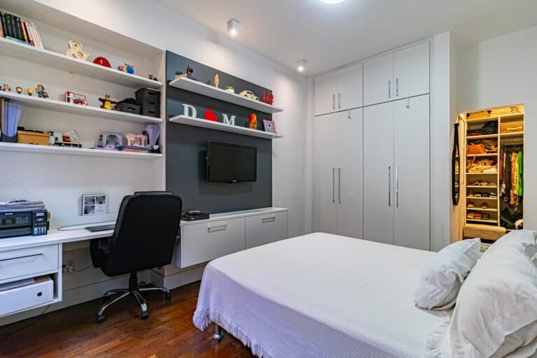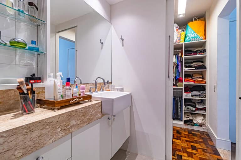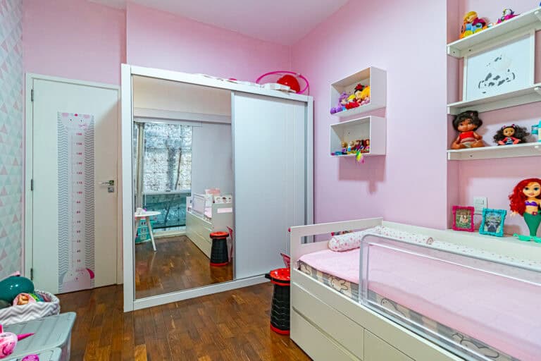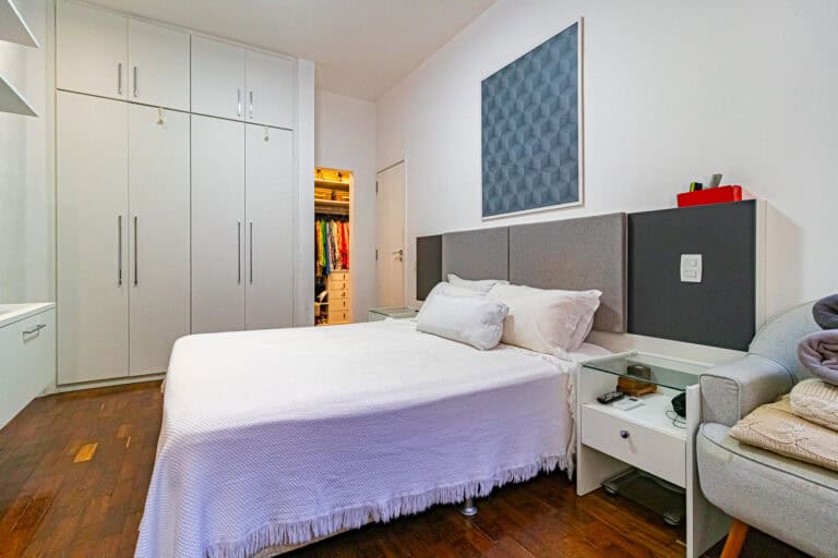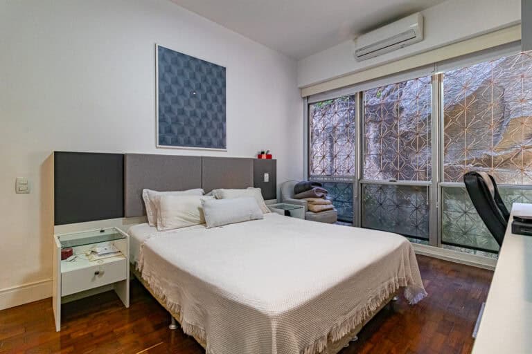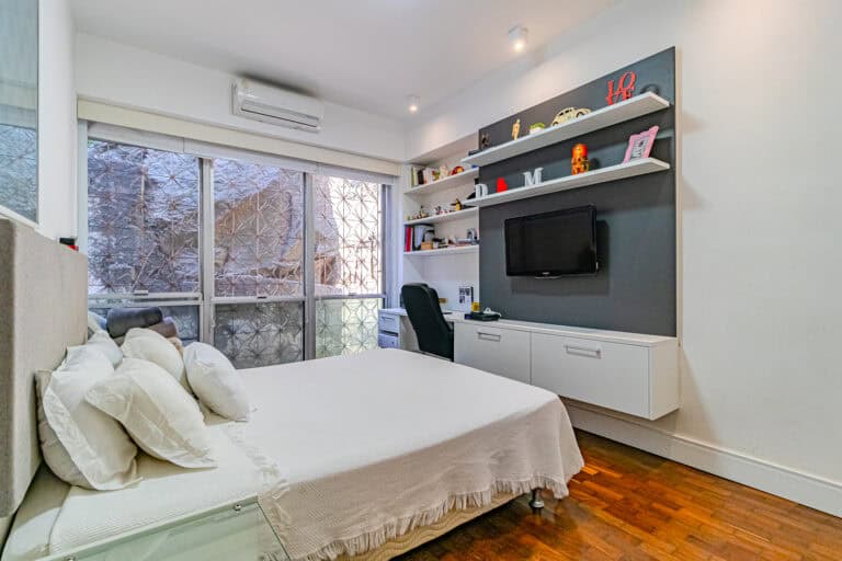 A área íntima conta com 2 quartos, sendo 1 suíte com closet e mais 1 banheiro social. Todos os cômodos contam com aparelhos de ar-condicionado tipo split.