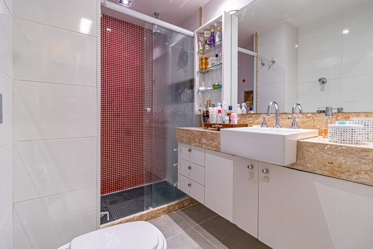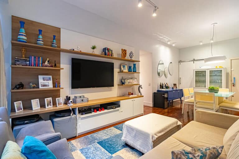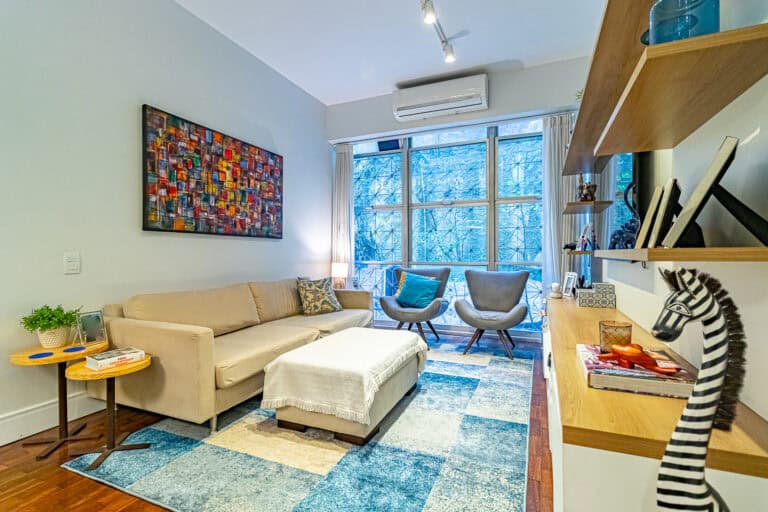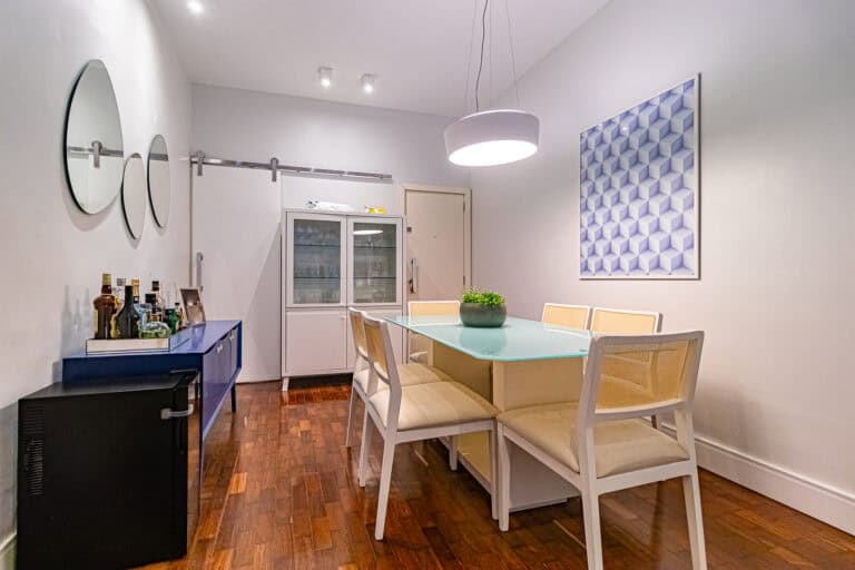 A sala conta com 2 ambientes e, assim como o resto do apê, está completamente reformada com materiais e acabamentos de 1ª linha.