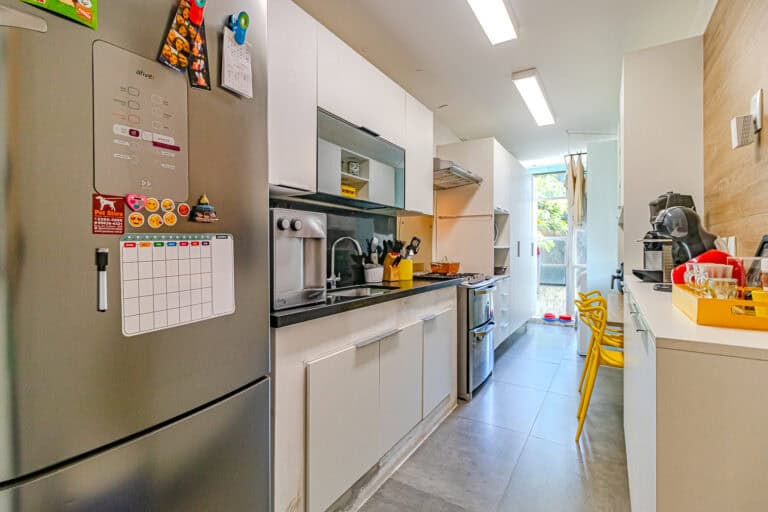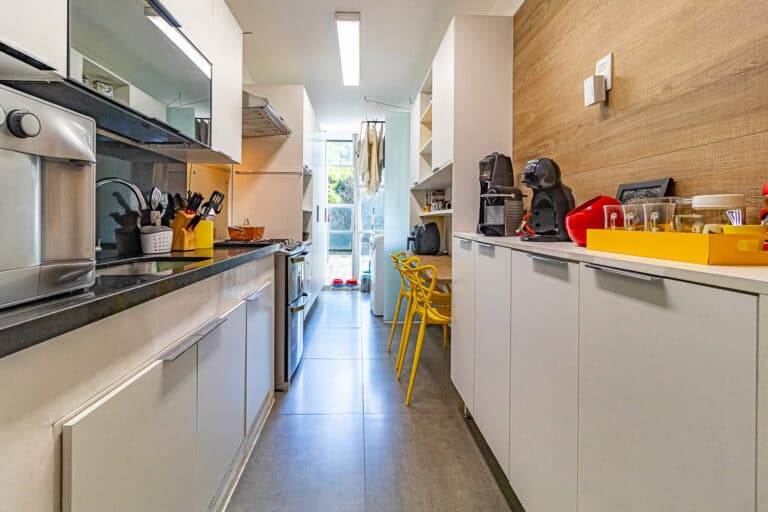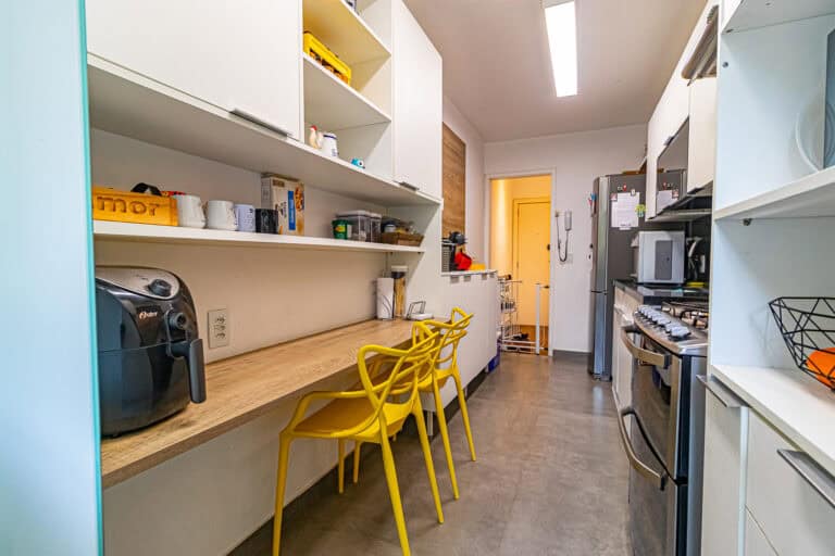A cozinha é bastante clara e repleta de armários. Conta com uma mesinha para refeições rápidas e área de serviço.