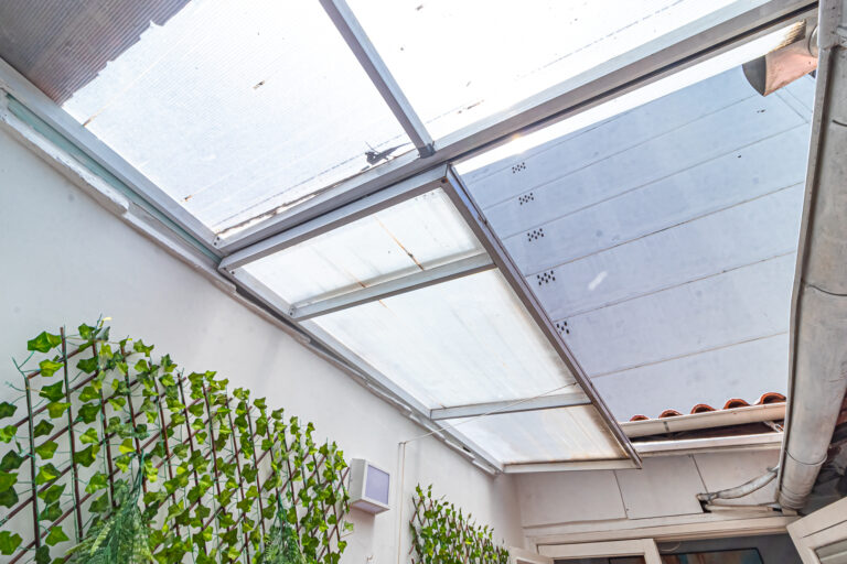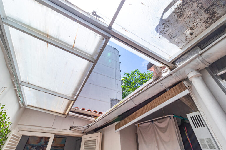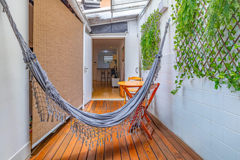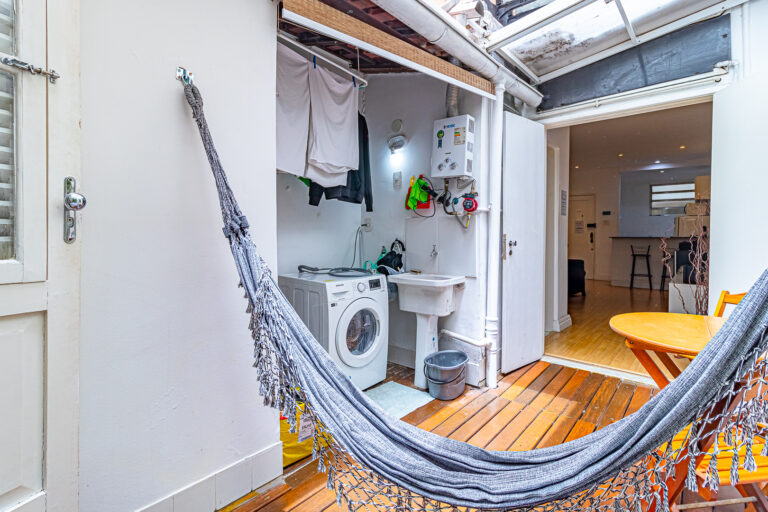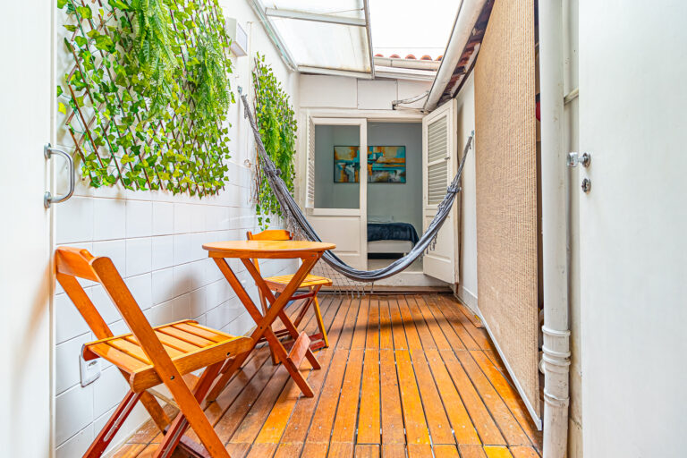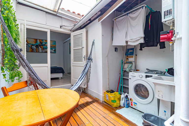 A área externa é super simpática e liga a sala ao quarto. Mas não se preocupe que você não vai tomar chuva, pois há um teto retrátil transparente cobrindo todo o espaço. Conta ainda com uma pequena lavanderia com máquina de lavar, tanque e varal.