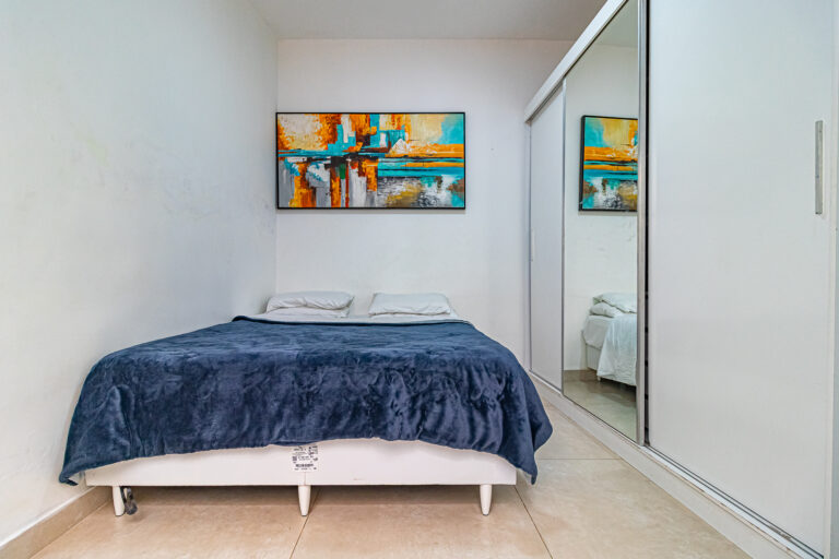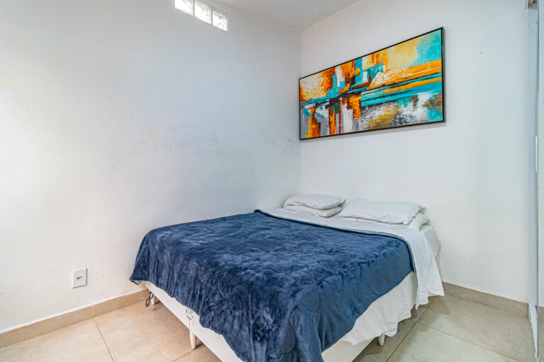 A suíte fica nos fundos do apartamento e conta com um lavabo.