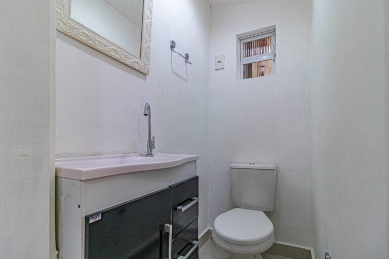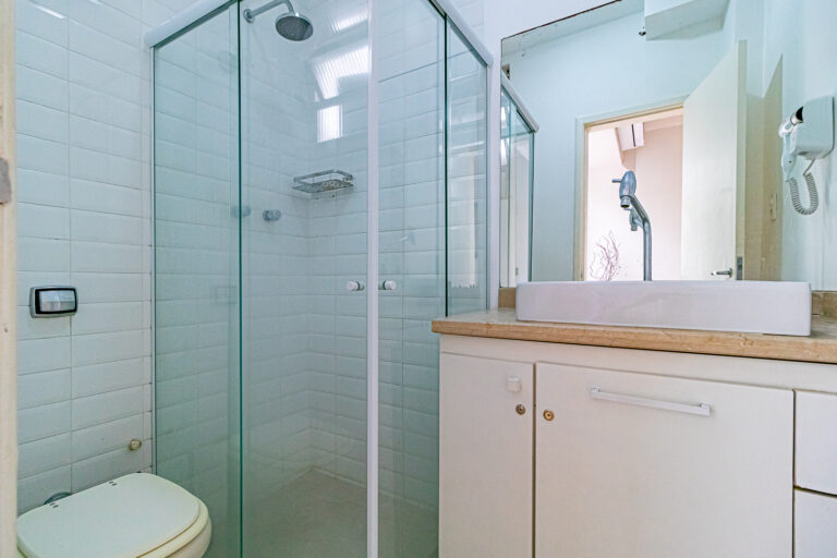 Entre a sala e a área externa, está o banheiro social. O único do apartamento com chuveiro.